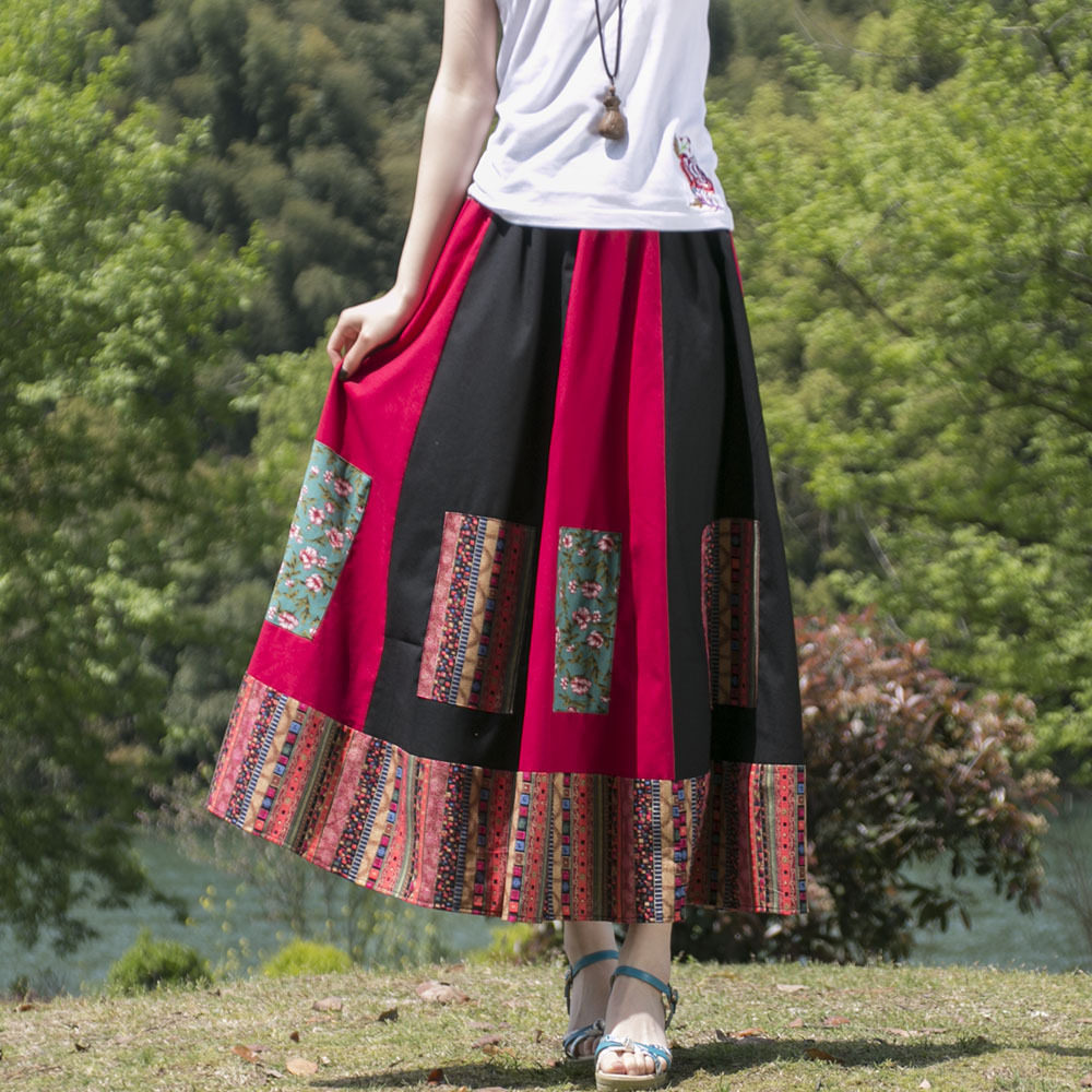 Летняя этническая юбка, пляжное платье, 2023, из хлопка и льна, этнический стиль, эластичная талия