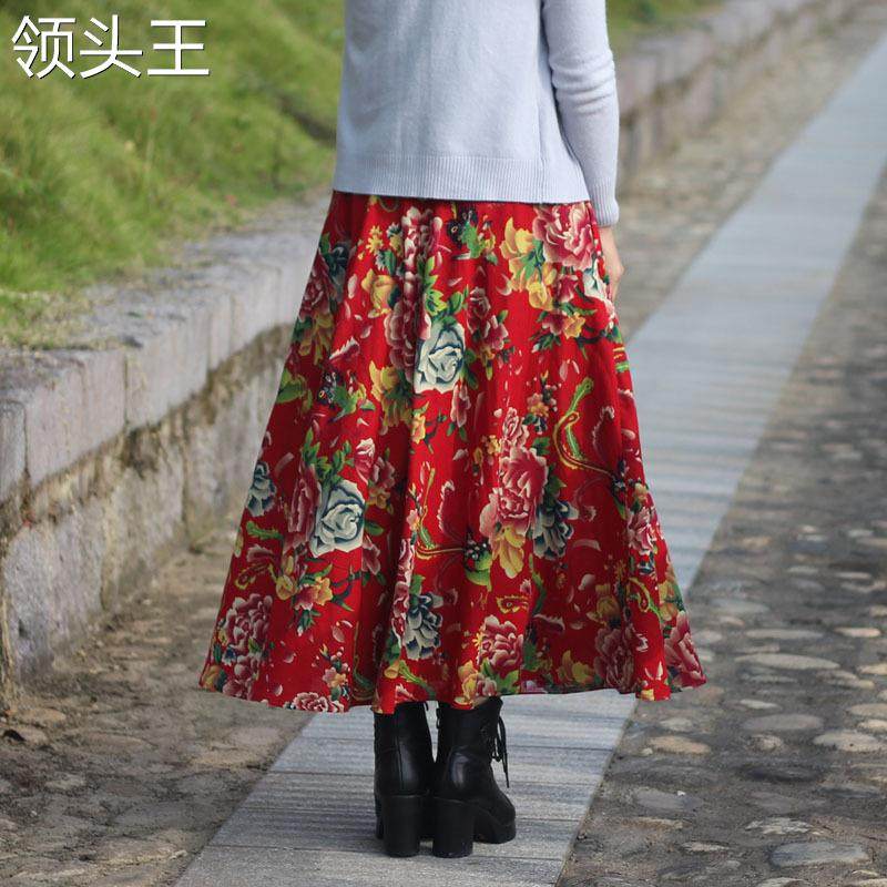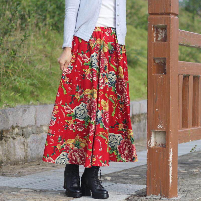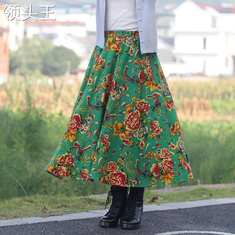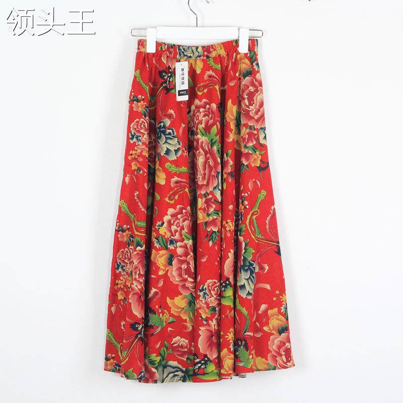 Этническая юбка, городской стиль, этнический стиль, из хлопка и льна, эластичная талия, А-силуэт