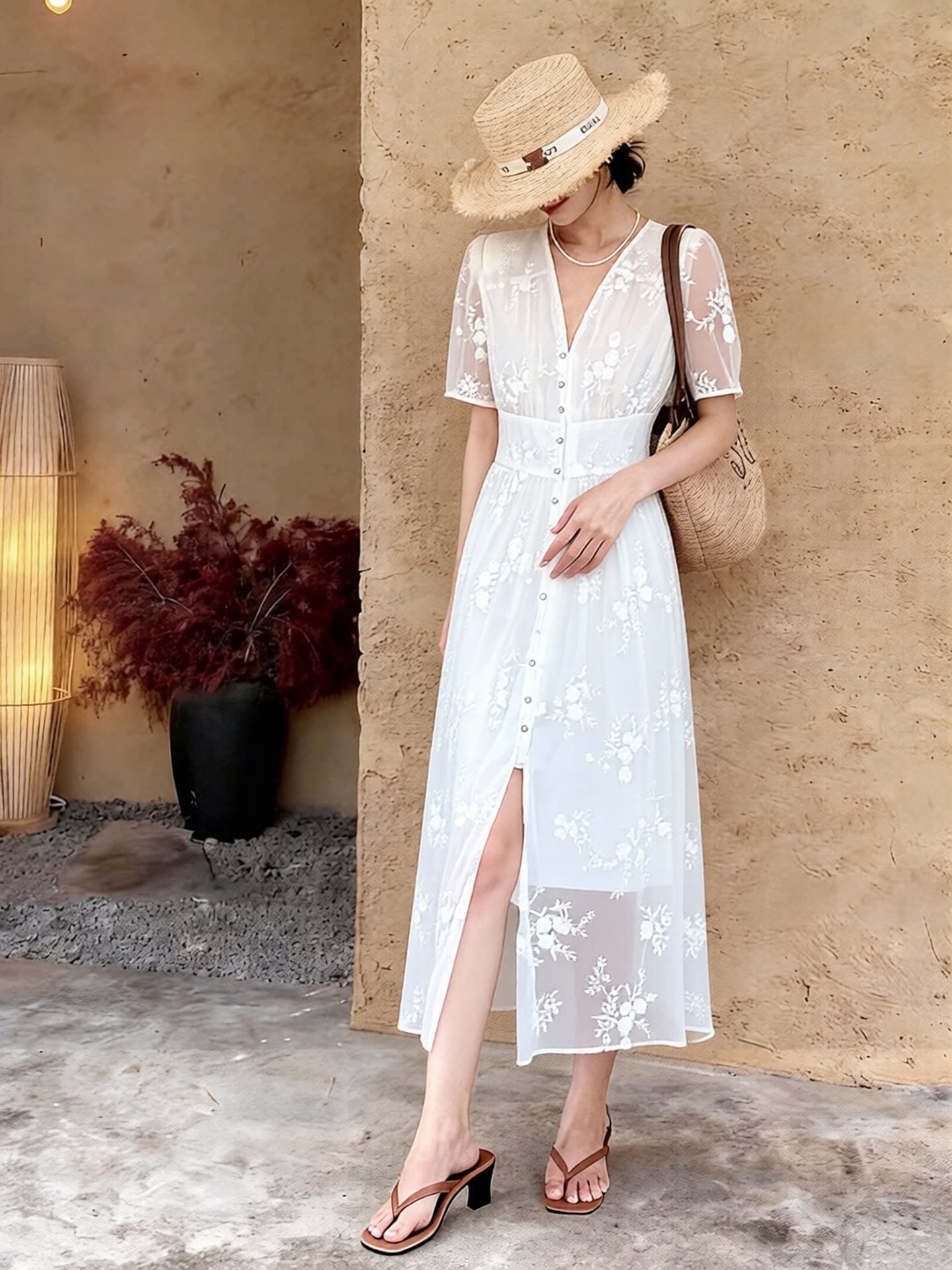 Кружевное летнее платье, приталенный корсет, элегантная длинная юбка, французский стиль, V-образный вырез, с вышивкой, рукава фонарики