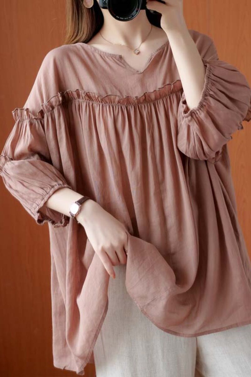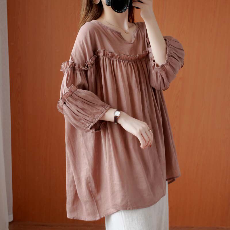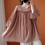 Летняя одежда, рубашка, подходит для полных девушек, большой размер, свободный крой, из хлопка и льна, короткий рукав