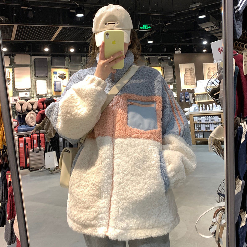 Wabtmore Lamb Velvet Jacket для женщин осенью и зимним корейским стилем свободный ленивый стиль шикарно блокирующий цвет с утолщенным воротником модный воротник модный