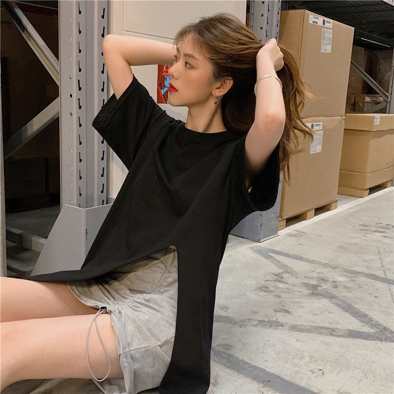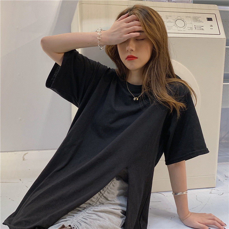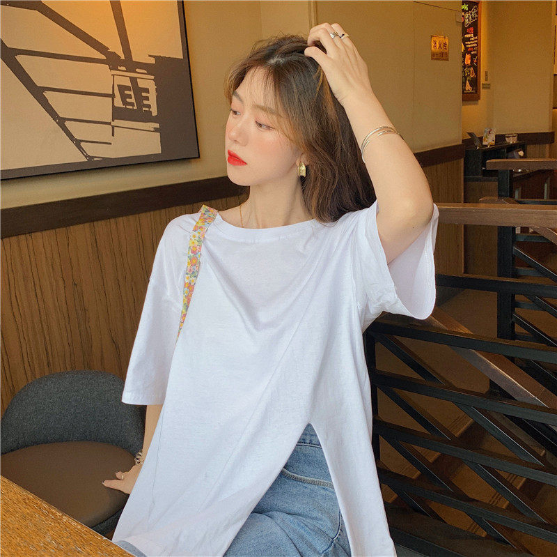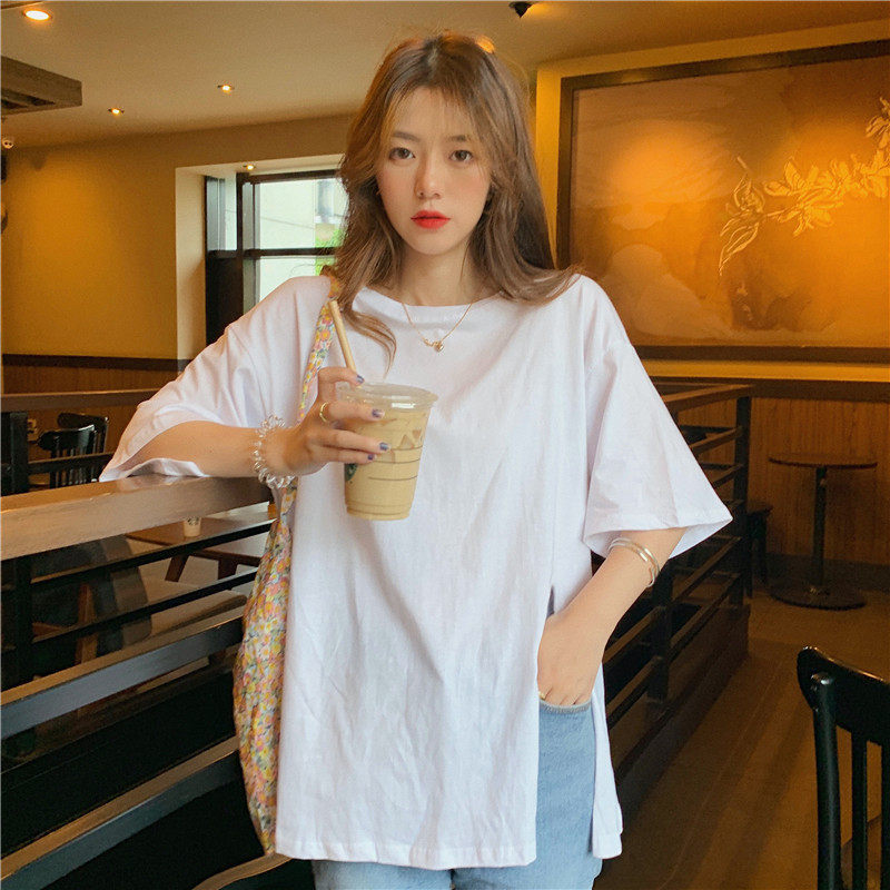 Летняя брендовая дизайнерская длинная белая футболка, популярно в интернете, тренд сезона, средней длины, короткий рукав, свободный крой
