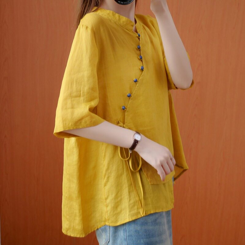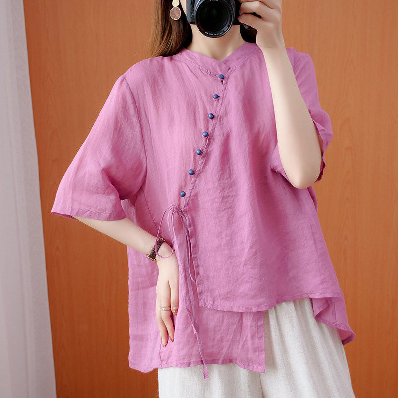 Рубашка, футболка, свободный крой, большой размер, из хлопка и льна, короткий рукав