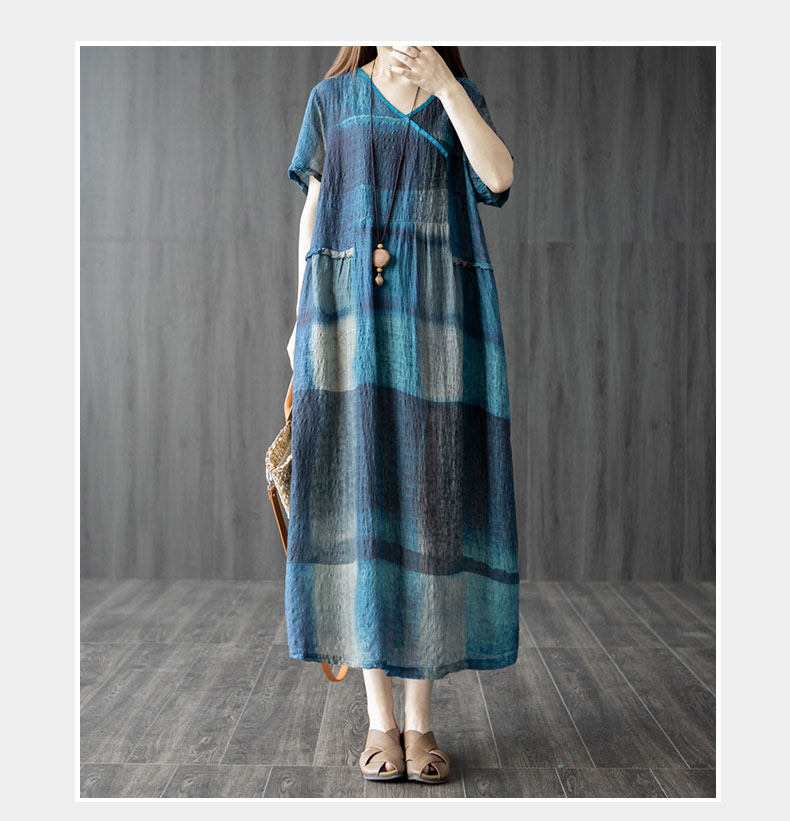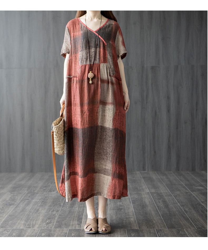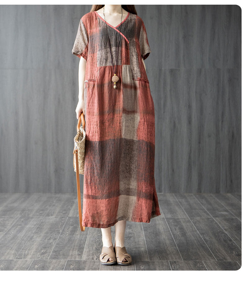 Летнее платье с коротким рукавом, длинная юбка, большой размер, из хлопка и льна, V-образный вырез, в западном стиле, средней длины