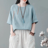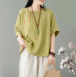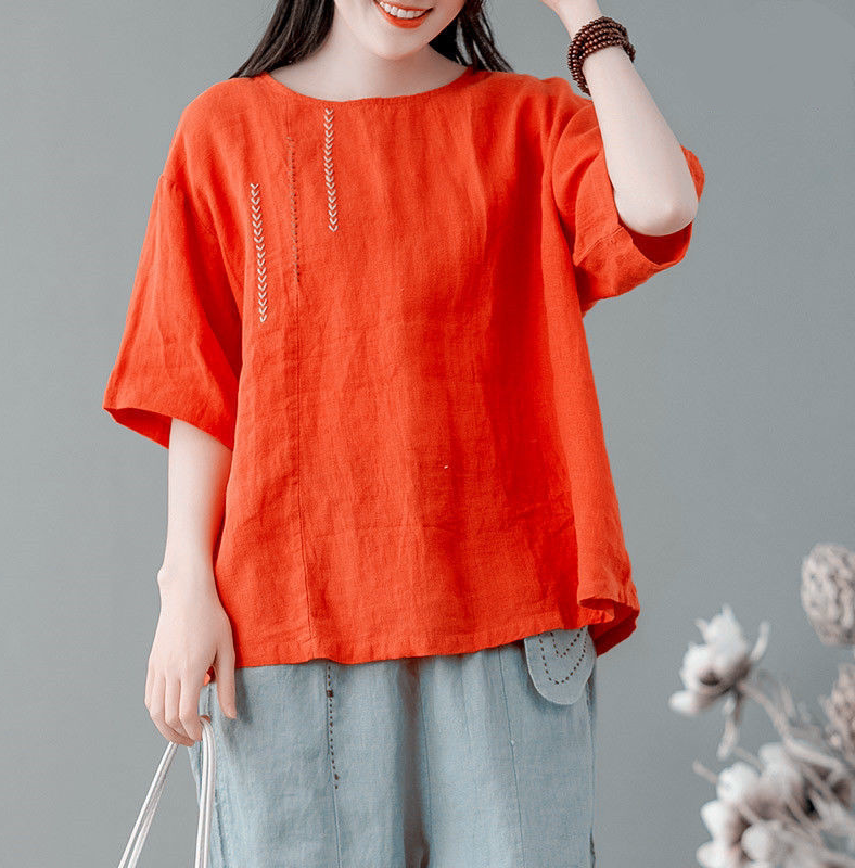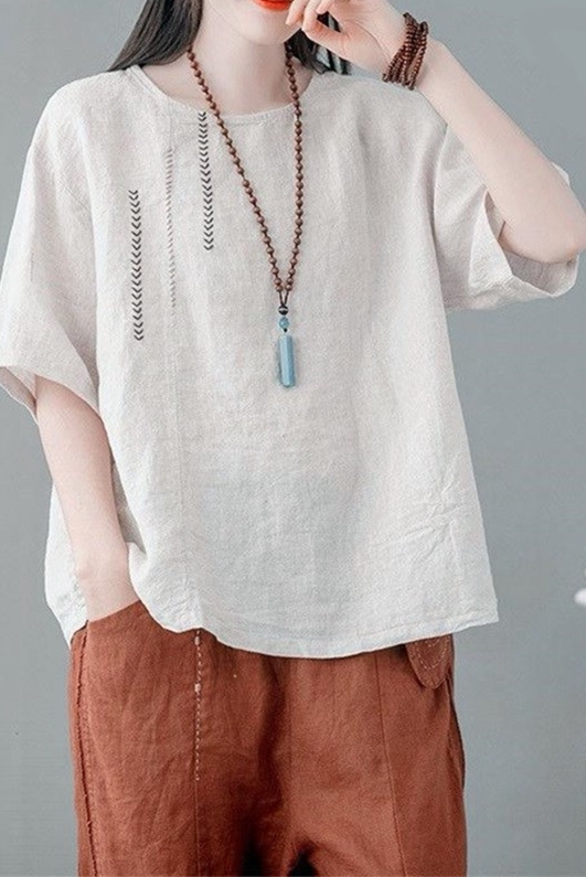 Тонкая футболка с коротким рукавом для отдыха, китайский стиль, в западном стиле, с вышивкой, из хлопка и льна, большой размер