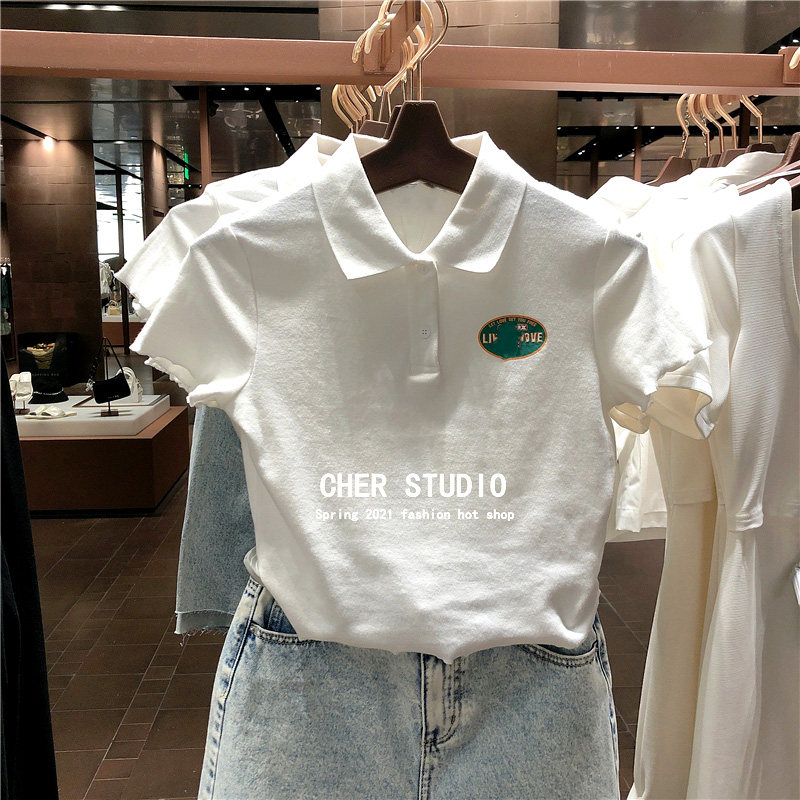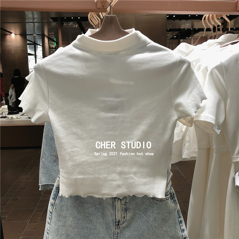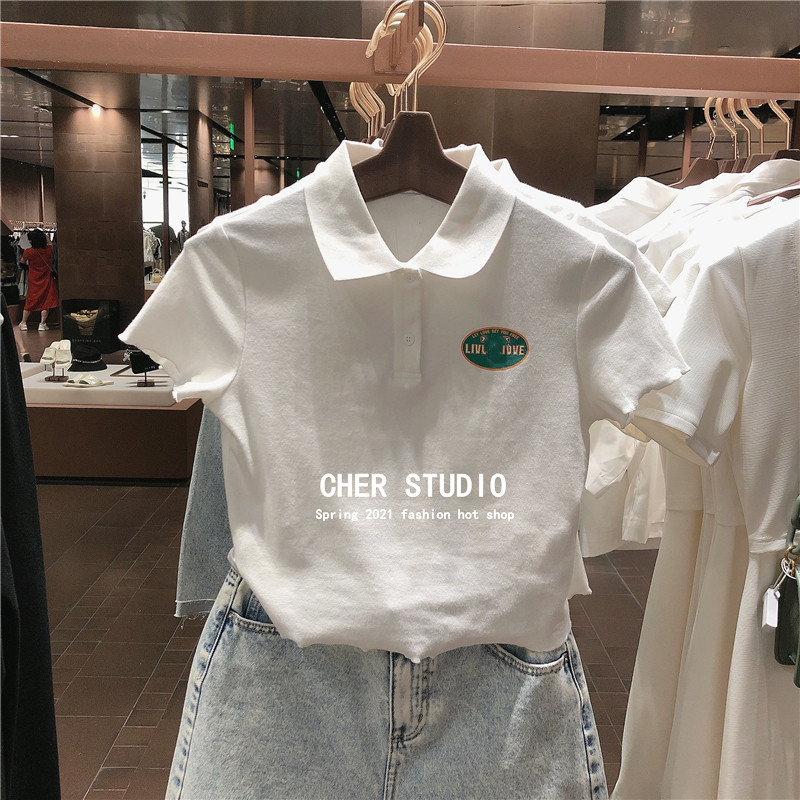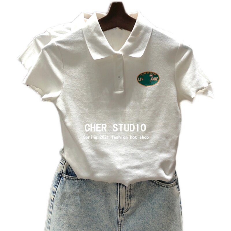 Южнокорейский товар, летняя короткая брендовая футболка, воротник поло, сезон 2021, высокая талия