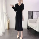 Демисезонный дизайнерский длинный трикотажный свитер, платье, тренд сезона, облегающий крой, V-образный вырез, в западном стиле