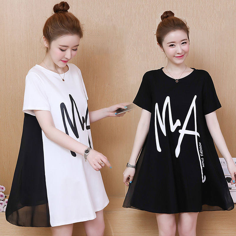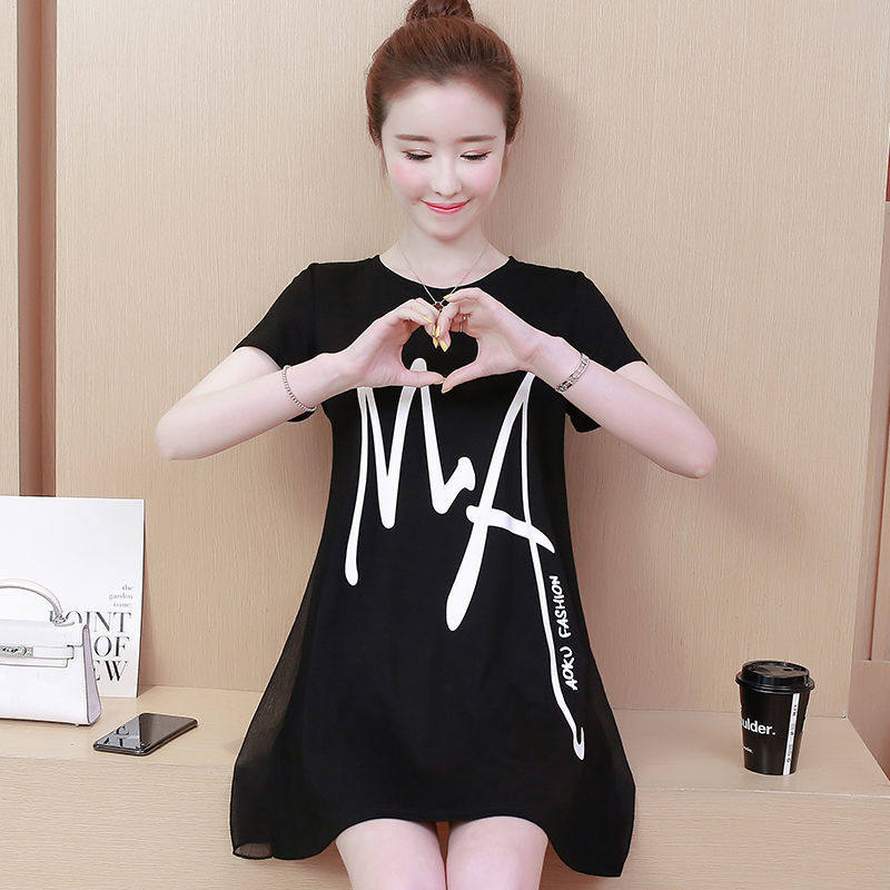 Летняя футболка с коротким рукавом, длинное платье, большой размер, в корейском стиле, средней длины