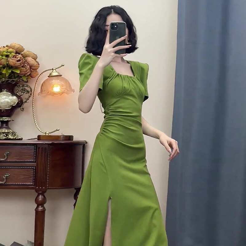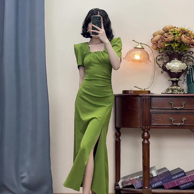 Элитное платье, свежая длинная юбка, коллекция 2023, яркий броский стиль, квадратный вырез