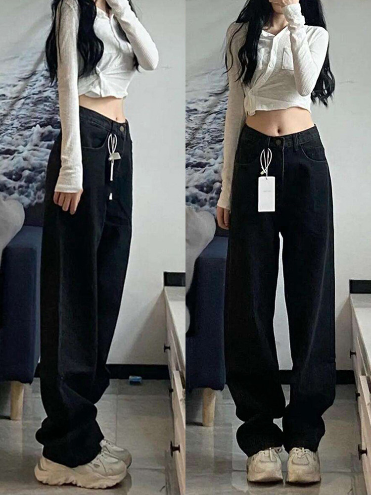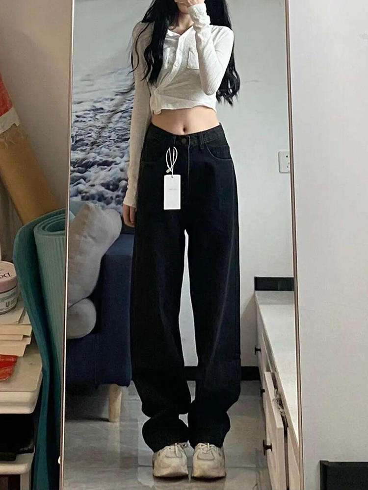 Черные цветные прямые свободные джинсы, летние штаны, высокая талия, большой размер, свободный крой