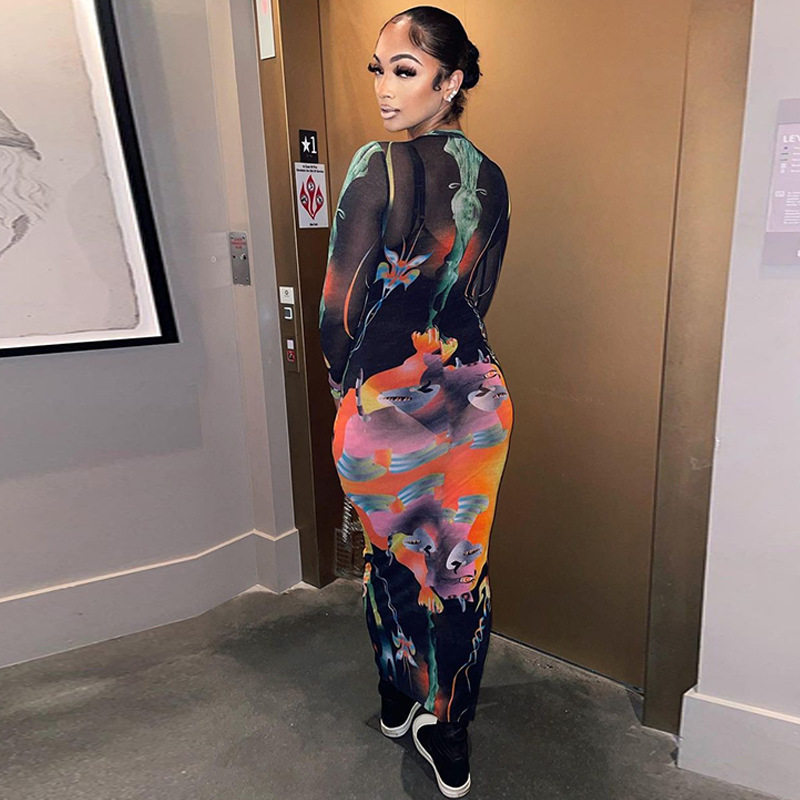 Печатная стройная раунда Следующая длинная рукава Skirrt Printed Slim Slim Slim Skirt Женщина