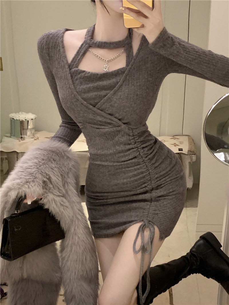 Демисезонное трикотажное платье, сексуальная сумочка на шею, базовая мини-юбка, изысканный стиль, на шнурках, с акцентом на бедрах