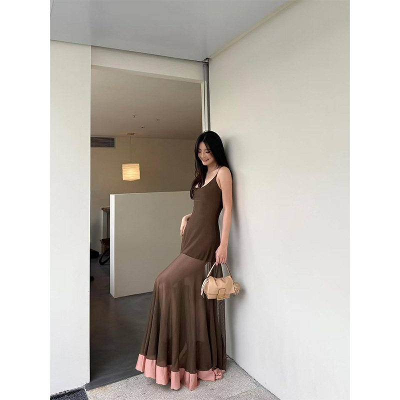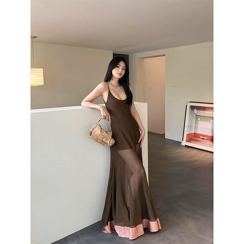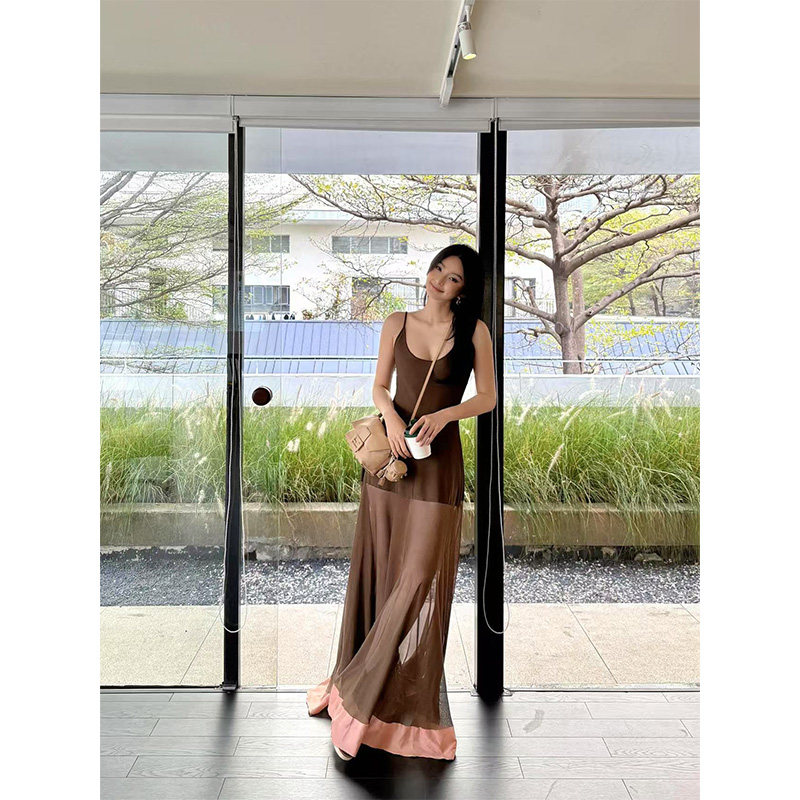 Поверните направо/Чен Бедро Чистая похоть темперамент сращивание сетки слегка прозрачное платье на подтяжках женская летняя шикарная длинная юбка