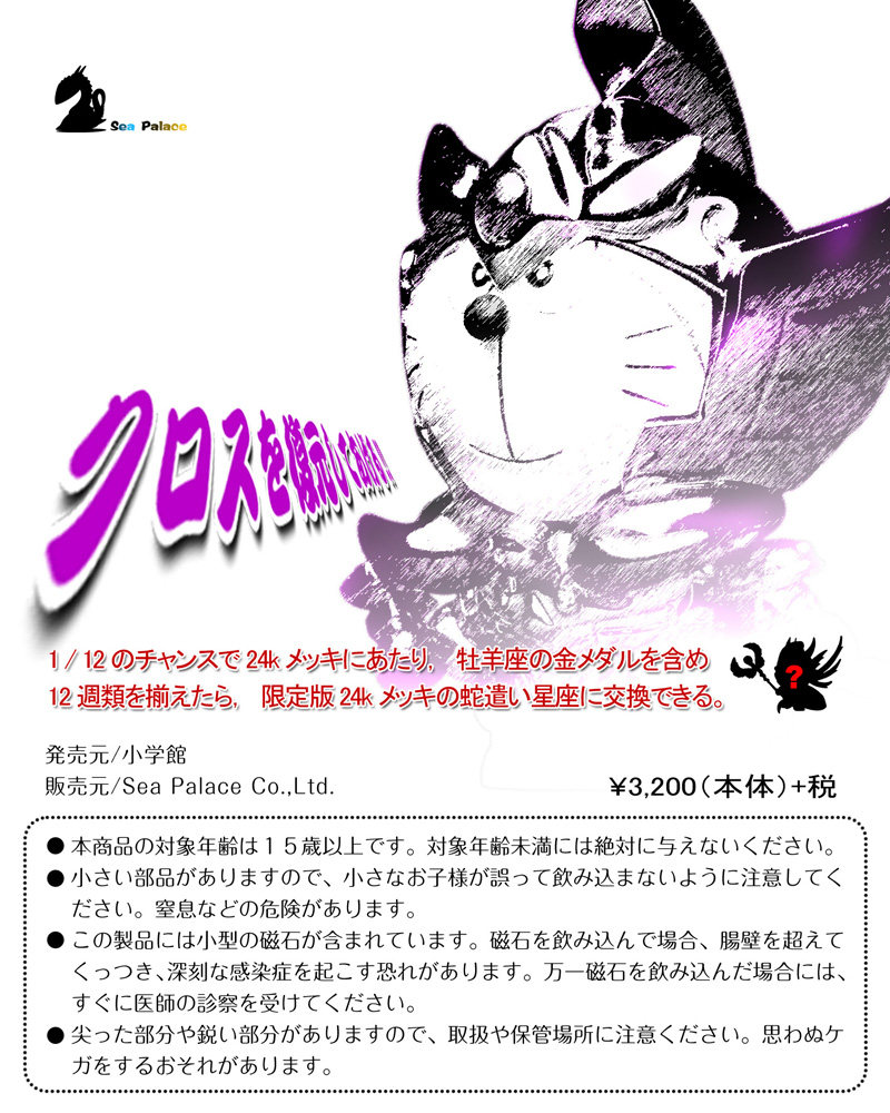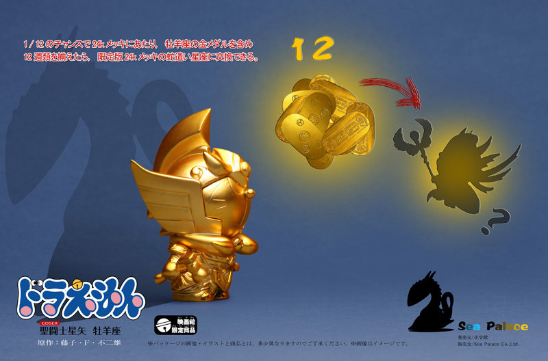 &[nbsp; 由小学馆授权,海洋神殿(S.P)发行的哆啦A梦coser系列,即将与大家见面。做为此系列款作品,选定为高人气角色-圣斗士星矢中黄金圣衣牡羊座。除了标准手型,还附牡羊座专属修复圣衣工具配件,配上哆啦A梦可爱造型,可呈现另一种与众不同的新鲜感。每盒均附送蛇夫座配件,集齐十二种配件可组成神秘的第十三位黄金圣斗士]—&[mdash;蛇夫座。]