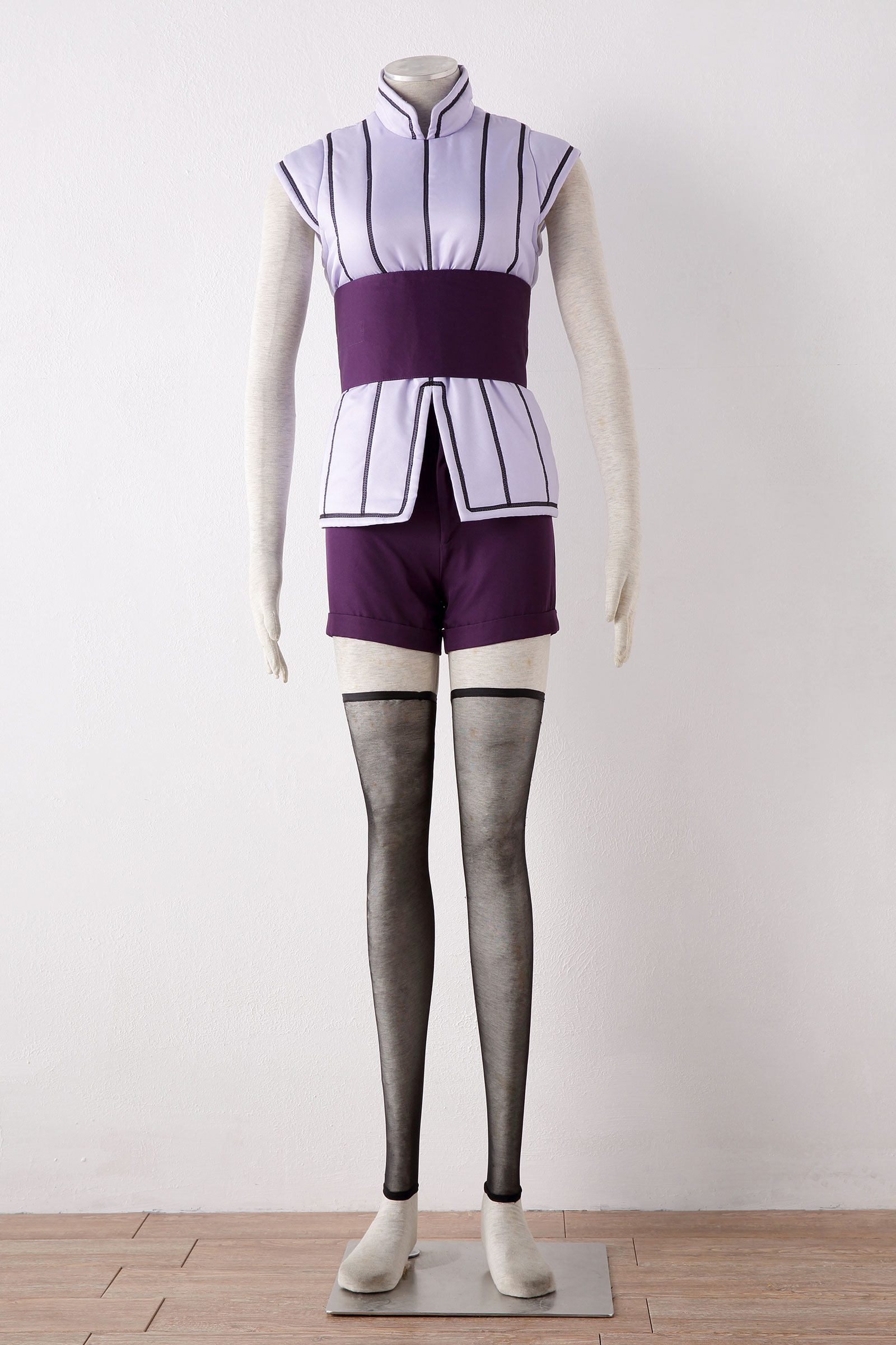 Комплект женской одежды из 12 предметов: безрукавка, пояс, шорты с заниженной талией, черные четырехкостные носки с открытым носком X2, парик, обувь, черно-белая сумка ниндзя, оружие X3, белая повязка, черная длинная сумка.