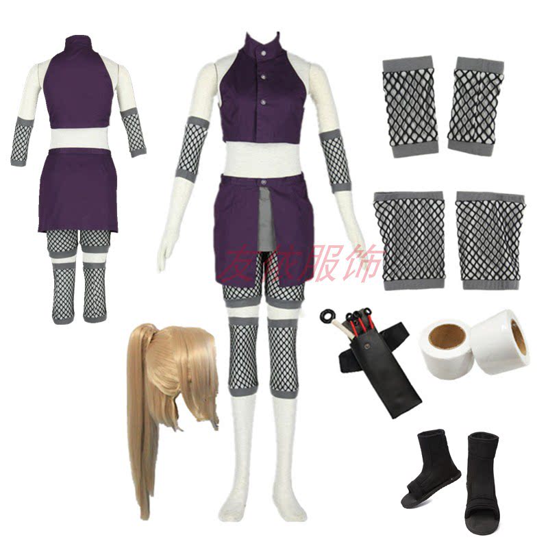 Комплект женской одежды из 10 предметов: короткая куртка без рукавов, короткая юбка, эластичные шорты, серо-черные сетчатые рукава до колен х 2, серо-черные сетчатые рукава до колен х 2, оружие х 3, белая повязка, черная сумка, туфли, парик.