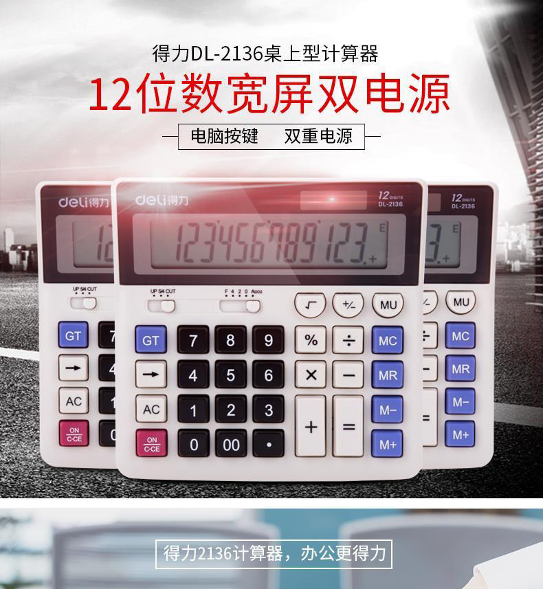 Deli 2136 Counter 12 -bit большой экранный солнечный сдвоенный калькулятор компьютерного офиса.