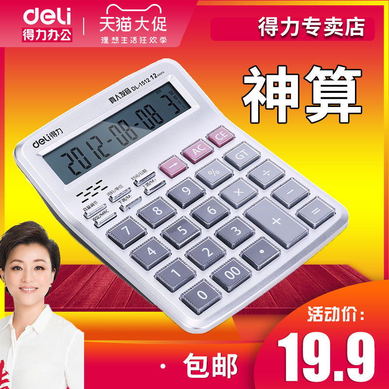 Deli 1512 Голосовой калькулятор Специализированная настоящая произношение Женского офиса поставляет моду 1541A Crystal Большой ключ многофункциональный голос Band может играть в компьютер 1526