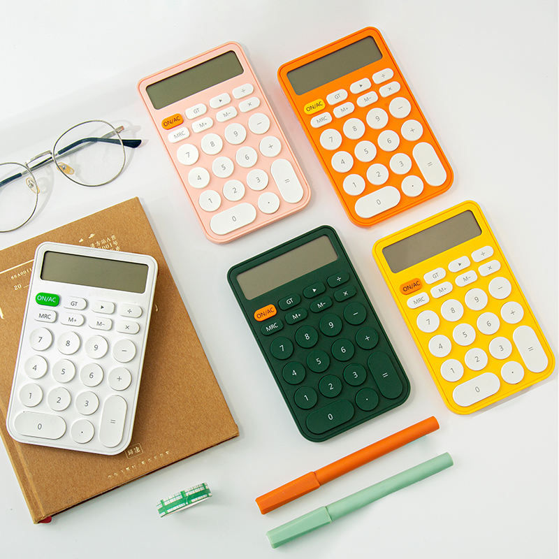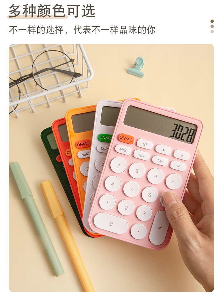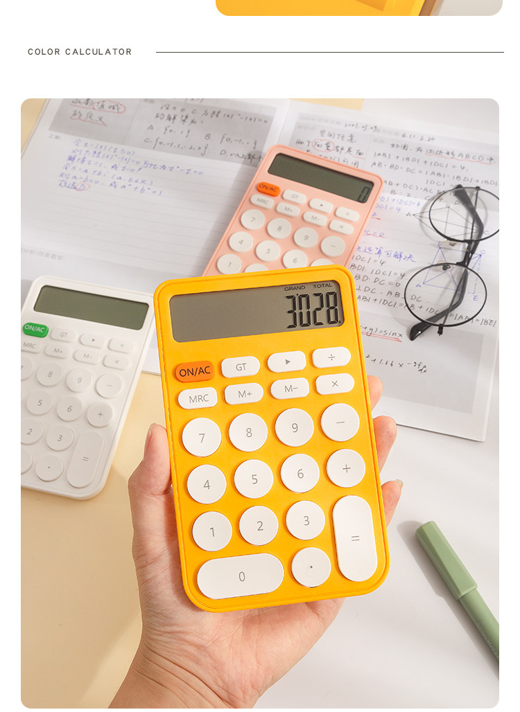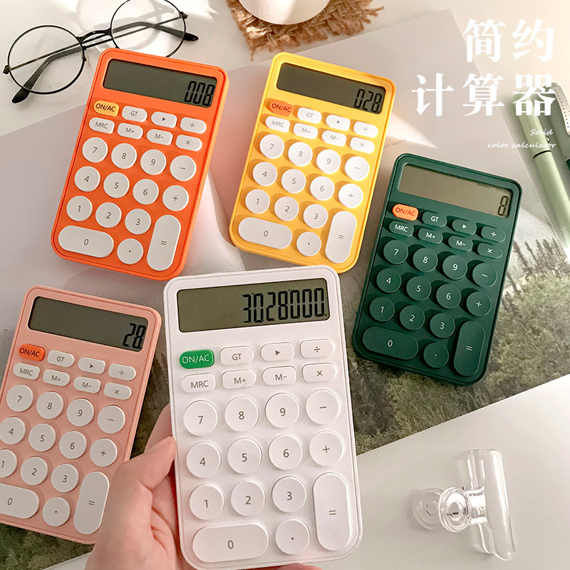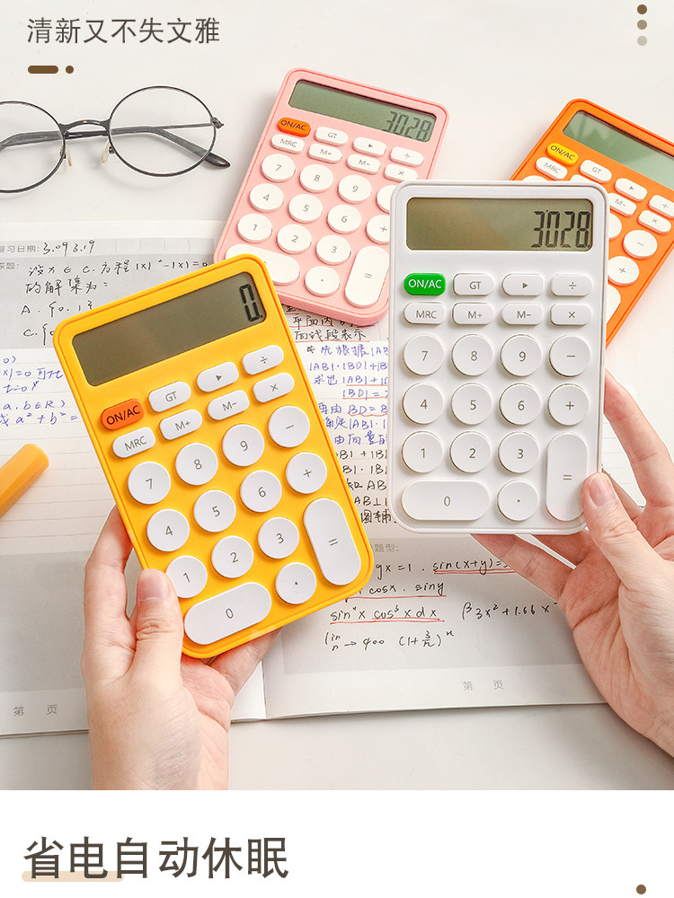 Три -мой класс простых учеников с твердым цветом с милыми мини -портативными электронными калькуляторами офис