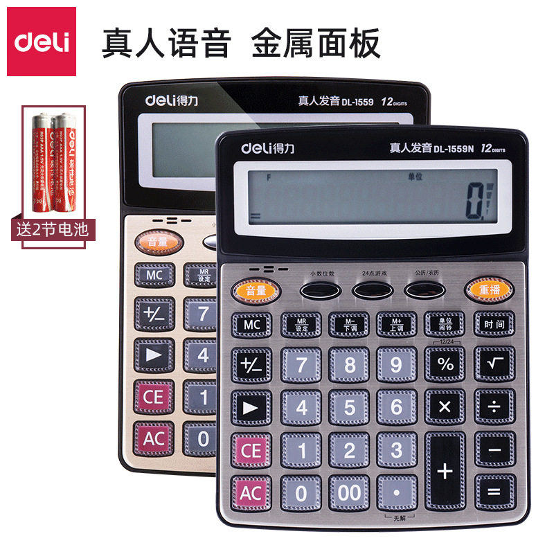 Deli 1559 1559N Голосовой калькулятор 12 -бит -металлическая панель широкоэкранный многофункциональный финансовое использование бизнес -офиса