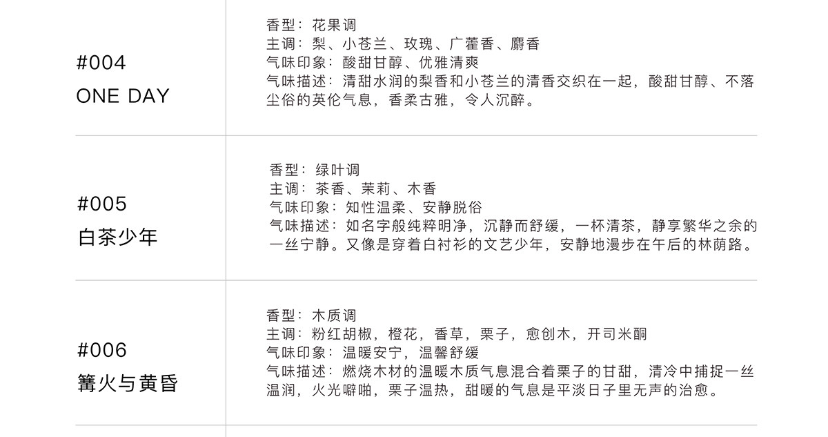 | Аромат: | 001 [Скрытие под карнизом] Морский тон, 002 [Fantasy Blue Bell] Цветочный ладан, 003 [Wushan Evening Bell] Восточные тона, 004 [Один день] Аромат цветочных фруктов, 005 [Белый чайный мальчик] Зеленый лист мелодия, 006 [костер и сумерки] Восточная мелодия, 007 [Ярко -оранжевый цветок] Цветочный аромат нейтральный аромат, 008 [Восточная Гардендия] Цветочный ладан, 009 [Valley Youlan] Цветочный ладан, 010 [взрывные персиковые] фрукты, 011 [ветер и волны] цветочный ладан, 012 [Древнее храмовое сандаловое дерево], 013 [Дикая местность кедра] деревянный цветочный аромат, 014 [Galaxy Roaming] Fuqi Xiang |