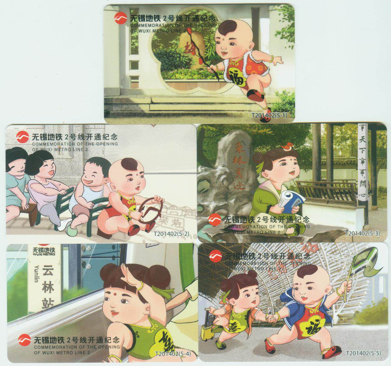 Line 2 Wuxi Metro 2 открывает памятную карту -fuxi Shuang, полный набор из 5, с книгой, использовался в мешках для сбора.