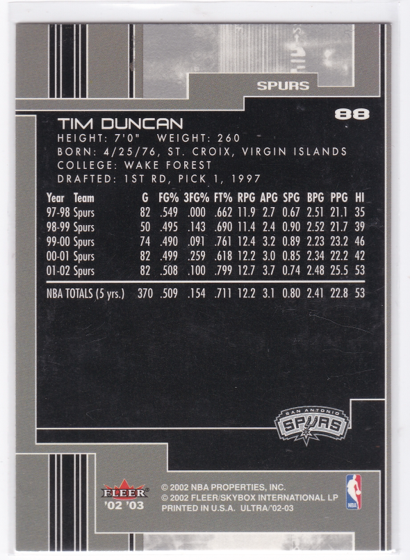 Звезда НБА Ками Дункан Флиер 02-03 Ультра № 88