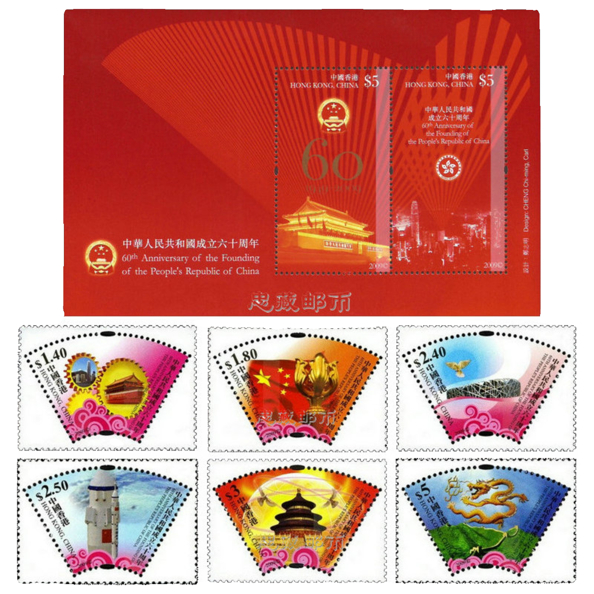 Постановка продажа 60 -летия Гонконга в Национальном дне Национального дня 2009 года, 1 маленький пакет, 6 филателистиков
