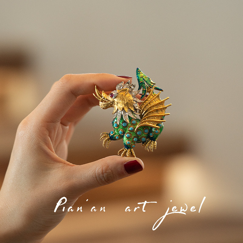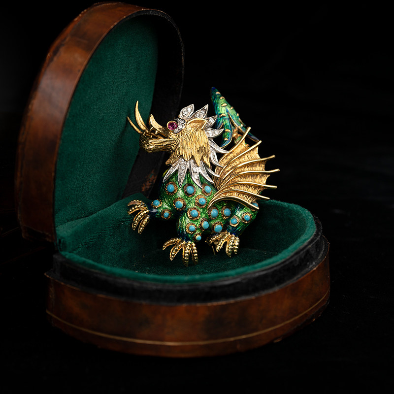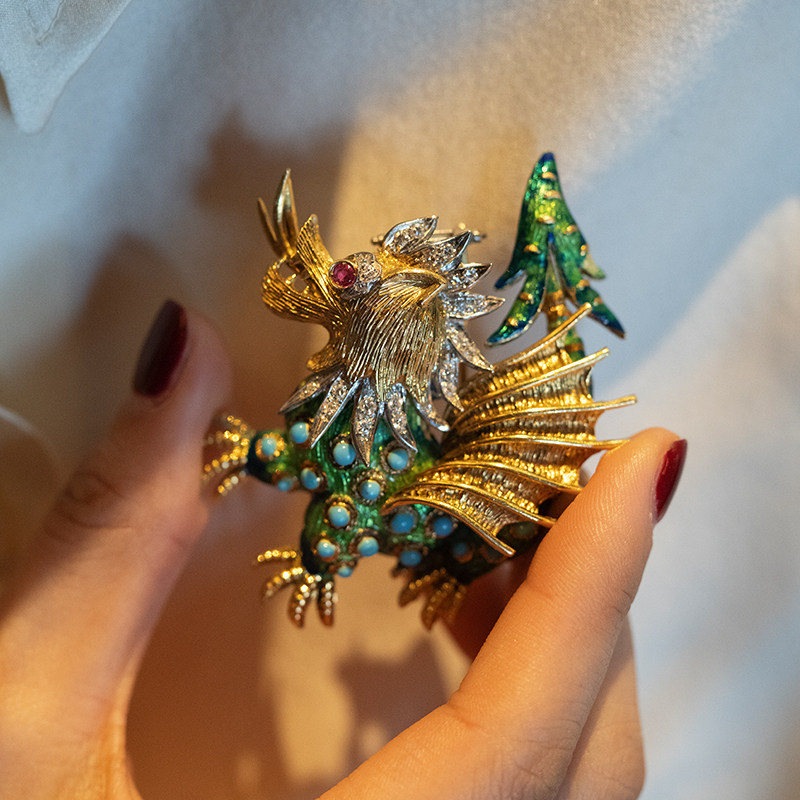 Антикварная рубиновая брошь, бирюзовая изысканная эмаль, 18 карат, Италия