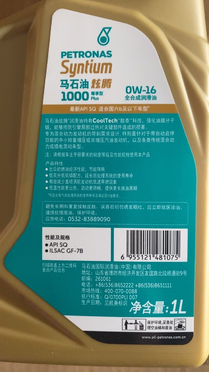 PETRONAS/马石油 Новейшее полностью синтетическое моторное масло Xuanteng 1000SQGF-7 0W-16.