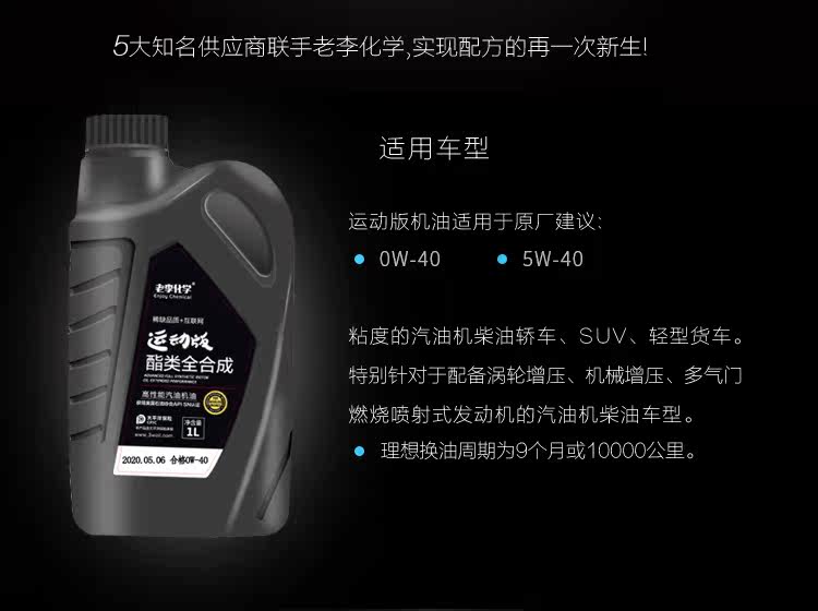 老李化学 Версия по машинной масле спортивной версии Dual -ESTER -Синтетическое моторное масляное масла Смазочное масло SN Class 0W40 1L A3B4