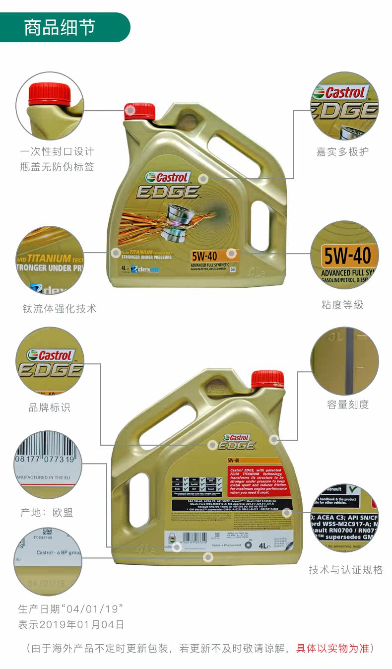 Кастрол Кастрол Многополюрный край титановый поток 5W-40 Полный синтетический двигатель Электрическое масло 4L