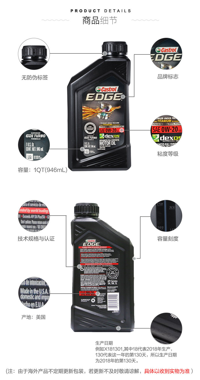 Кастрол Кастрол Полярная титановая жидкость 0W-20 1QT*4 Оригинальное импортное полное синтетическое автомобильное моторное масло