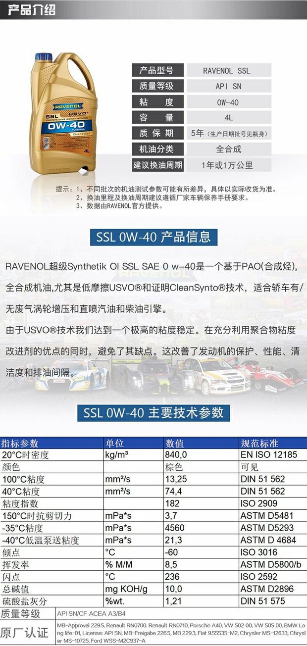 Германия Ravenol Lafeng USVO All 0W-40 Полное синтетическое моторное масло SSL Смазочное масло 5L