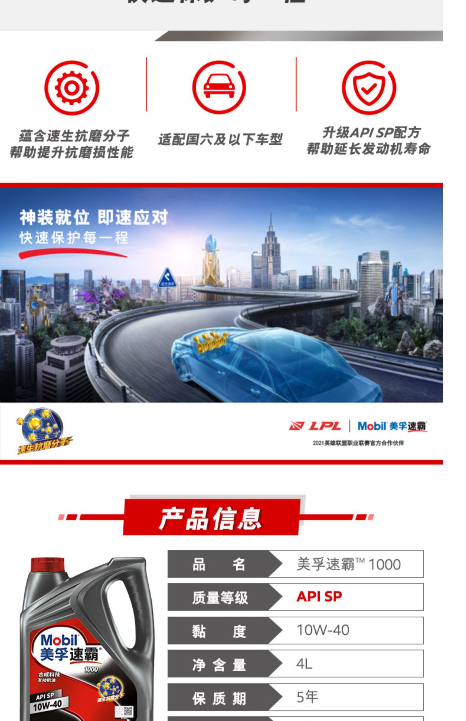 Подлинная Mobil Mobil Speed 1000 10W-40 SP 4L Синтетическая технология моторное масло масла
