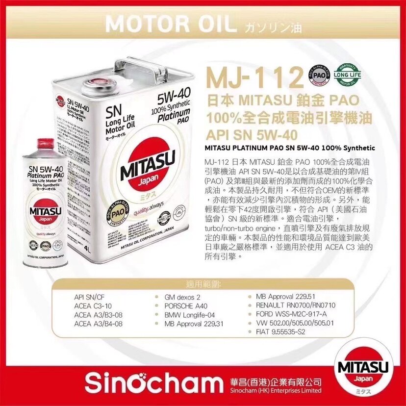 Оригинальная Япония Mitasu/Meida Speed Platinum Edition Edition Полное синтетическое масло PAO 5W40 4L 1L