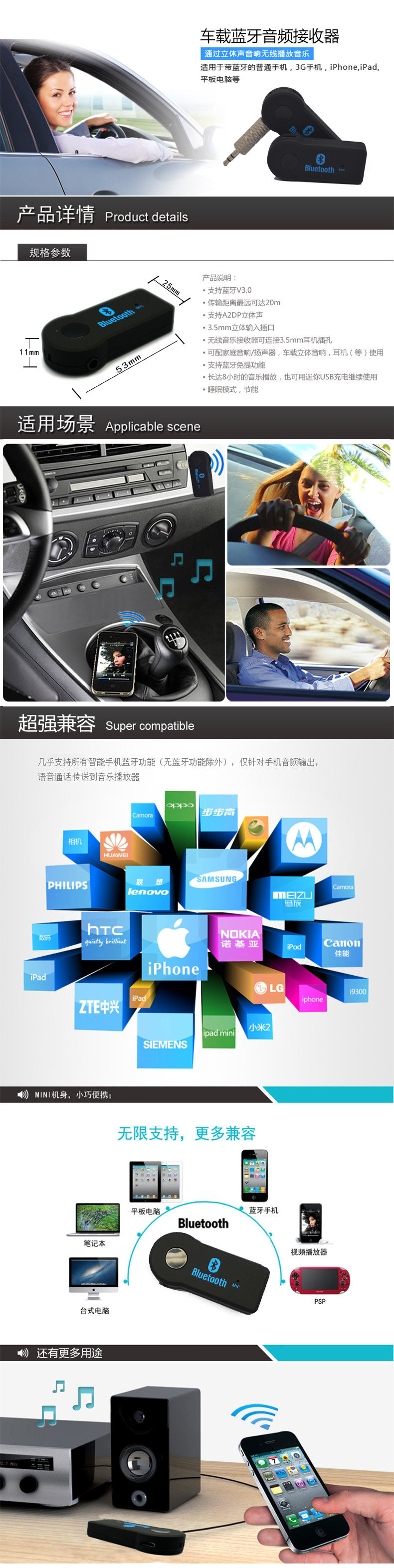 Этот музыкальный приемник можно использовать практически для всех аудио -приемников с входными пробками, включая автомобильные устройства.Динамики дома или аудиосистема автомобиля подключены к музыке, полученной от вашего смартфона и MP3.Наслаждайтесь Supreme Car Music и Call Solutions, и используйте смартфоны, чтобы вызвать и наслаждаться музыкой через звук автомобиля.Прижмите аккуратно, чтобы не звонить, оценить музыку, хранящуюся по телефону, и даже играйте в интернет -трансляцию.Этот продукт имеет встроенное эхо для устранения микрофона, и он может легко переключаться между музыкой и телефоном только с одной кнопкой.