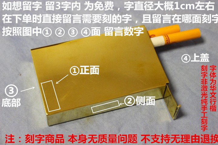 Принадлежит нашему магазинуМедная белая стальная сигаретная кастрюльТовары могут быть выгравированы на немВсе продукты, которые выбирают сервис надписей в нашем магазине, принадлежатЧастная настройка После получения продукта он не поддерживает 7 дней без причин для возвращения и обмена (проблема качества не возвращается, нет отказа в Китае плохого обзора)СущностьРука -engraving может быть не такой идеальной Слово только выгравированочерный принадлежат кПостоянное резервирование