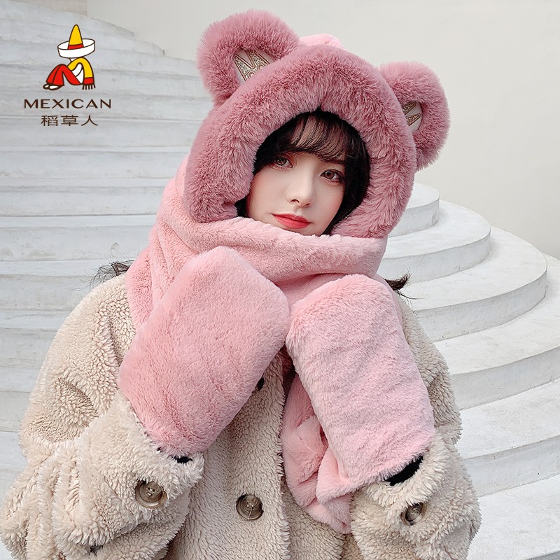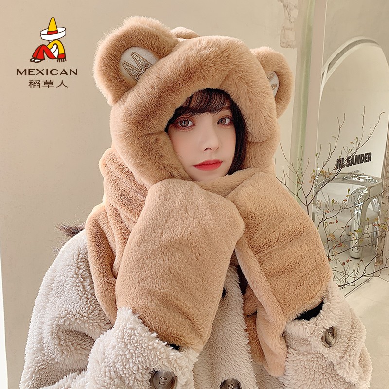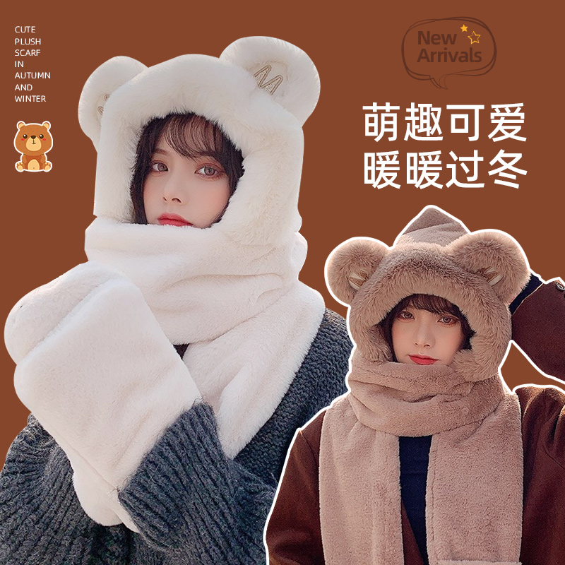 Демисезонная милая шапка, зимний бархатный шарф, удерживающие тепло перчатки, комплект, с медвежатами, 3 предмета