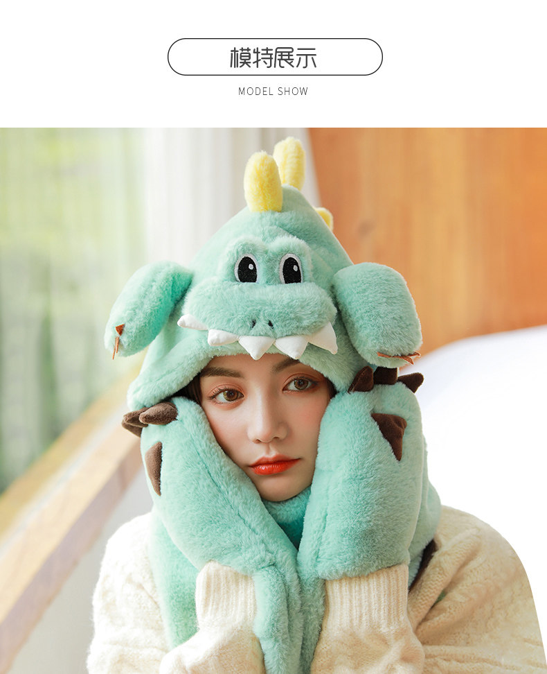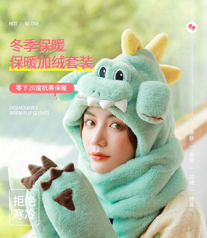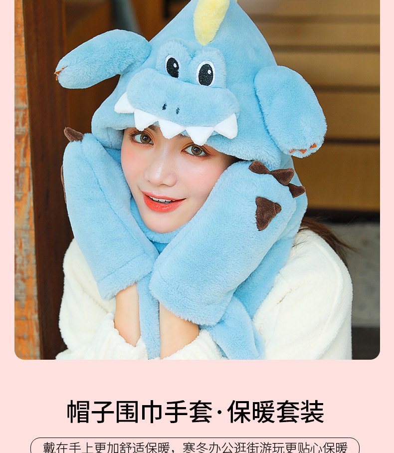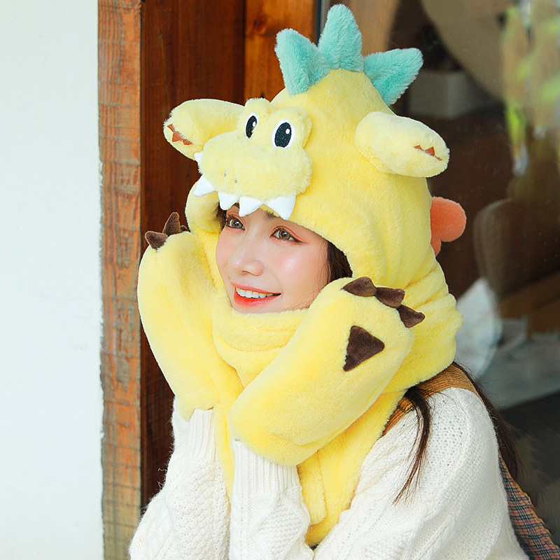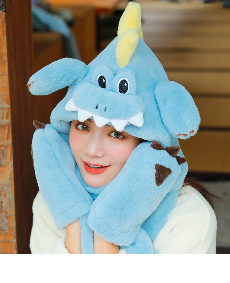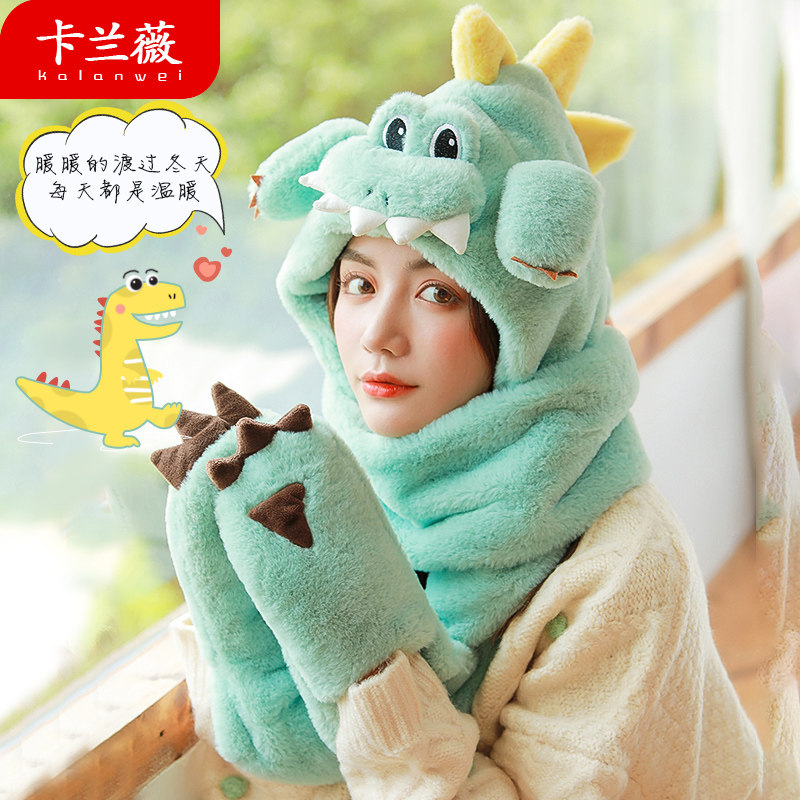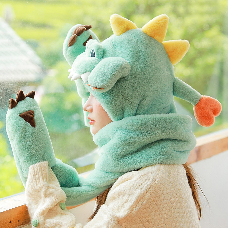 Динозавр, шапка, демисезонный шарф, удерживающие тепло милые плюшевые мультяшные перчатки, комплект, в корейском стиле, 3 предмета