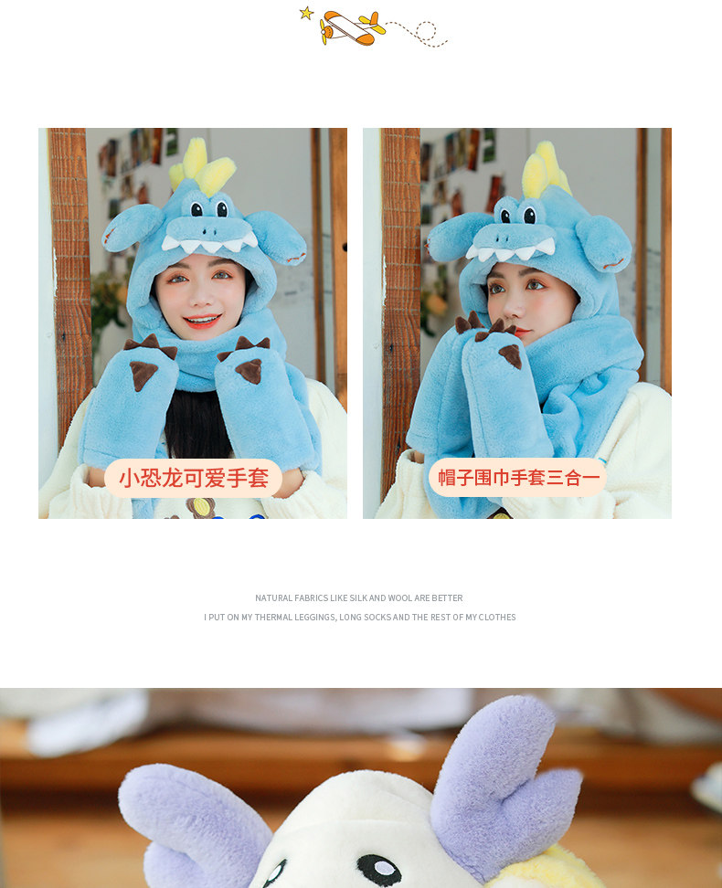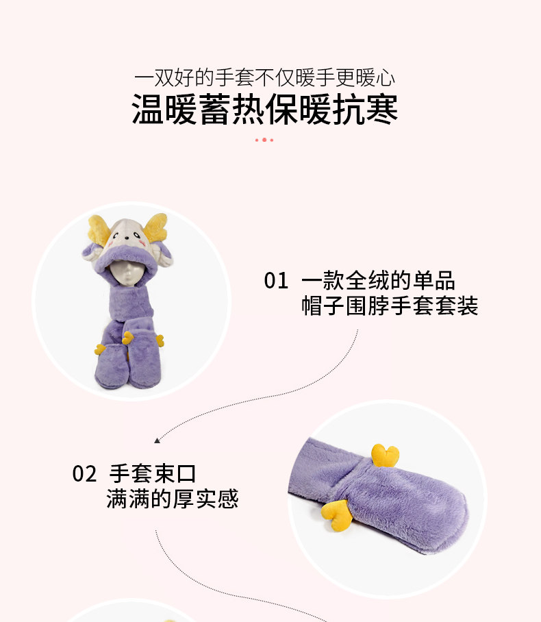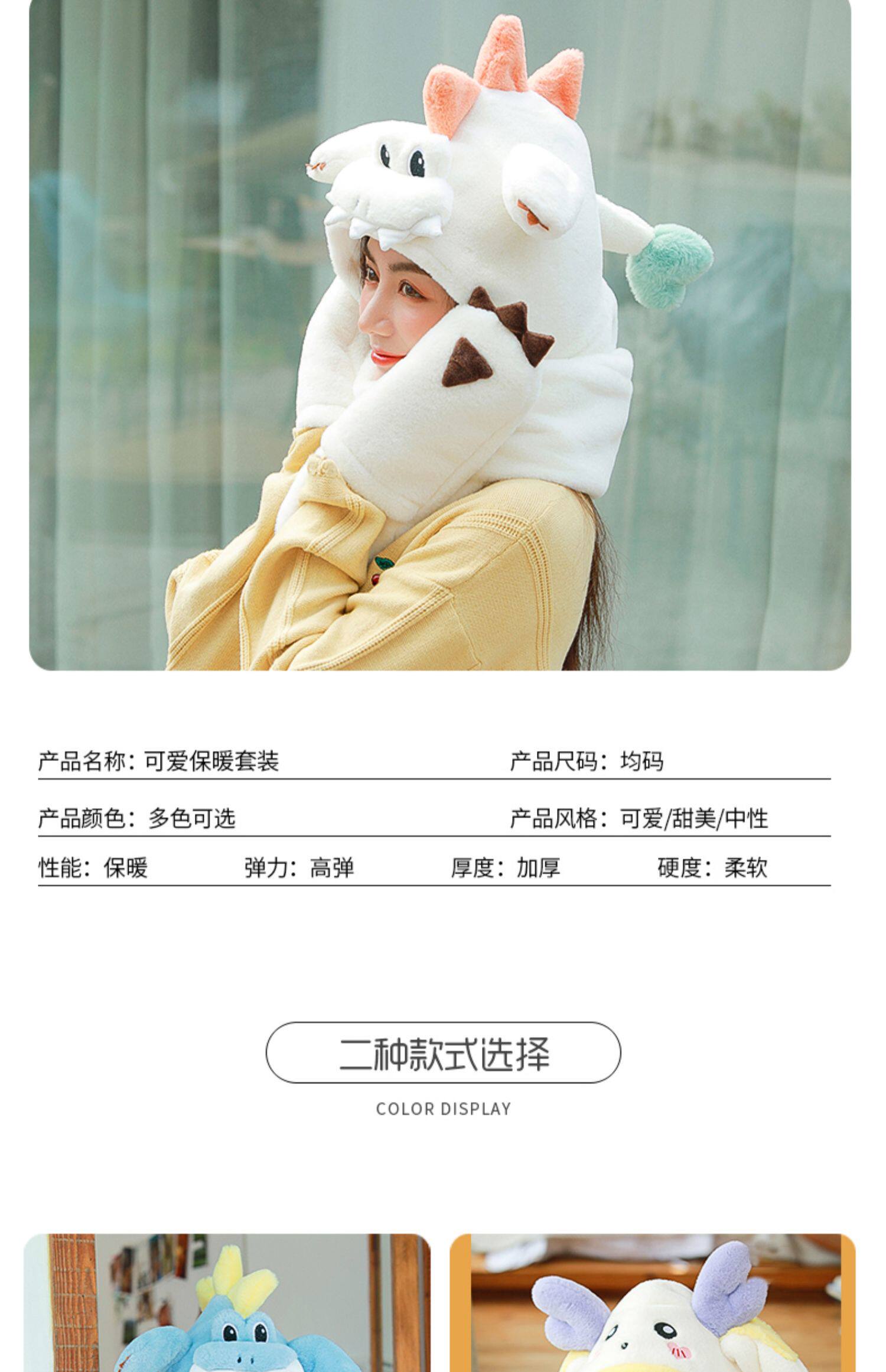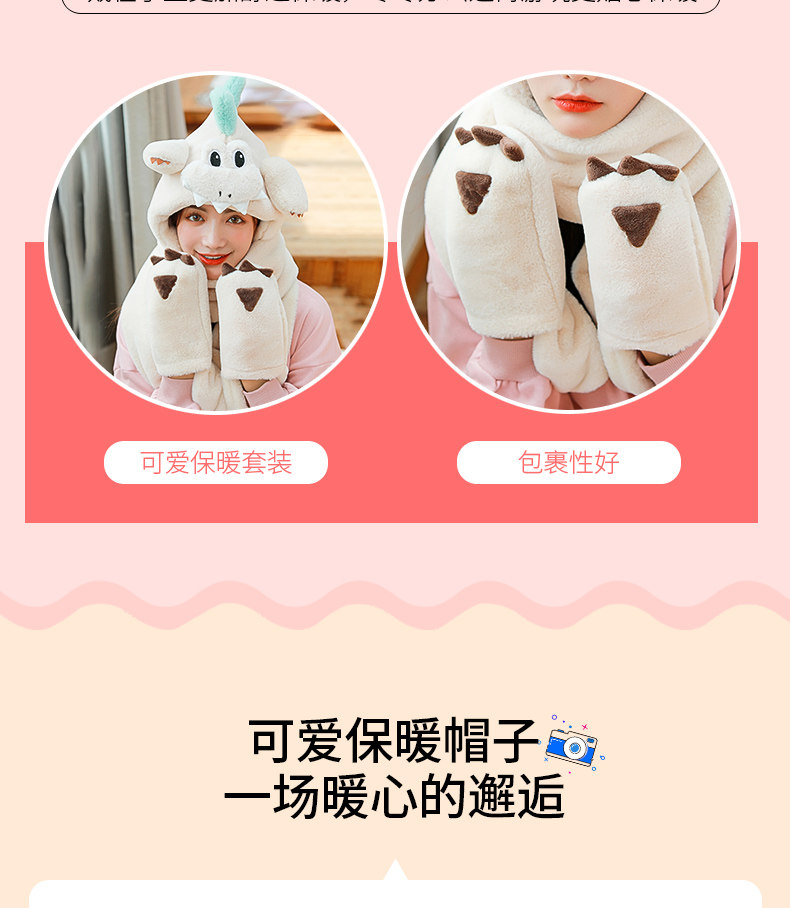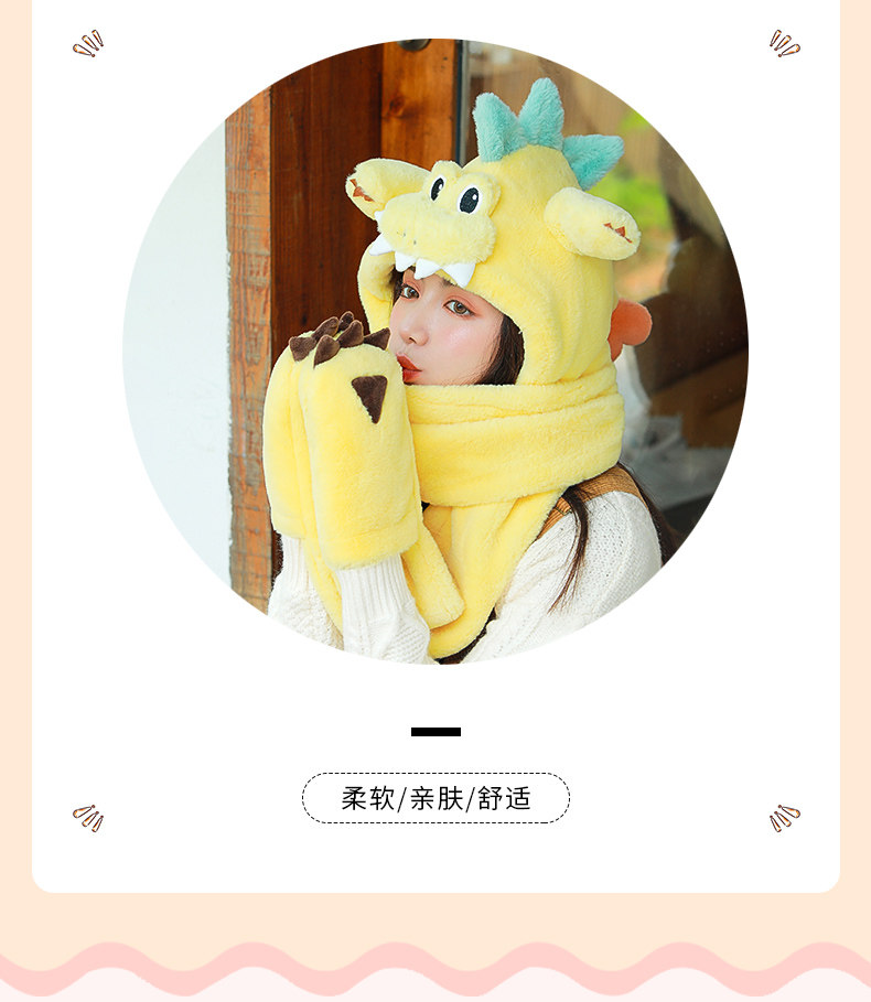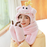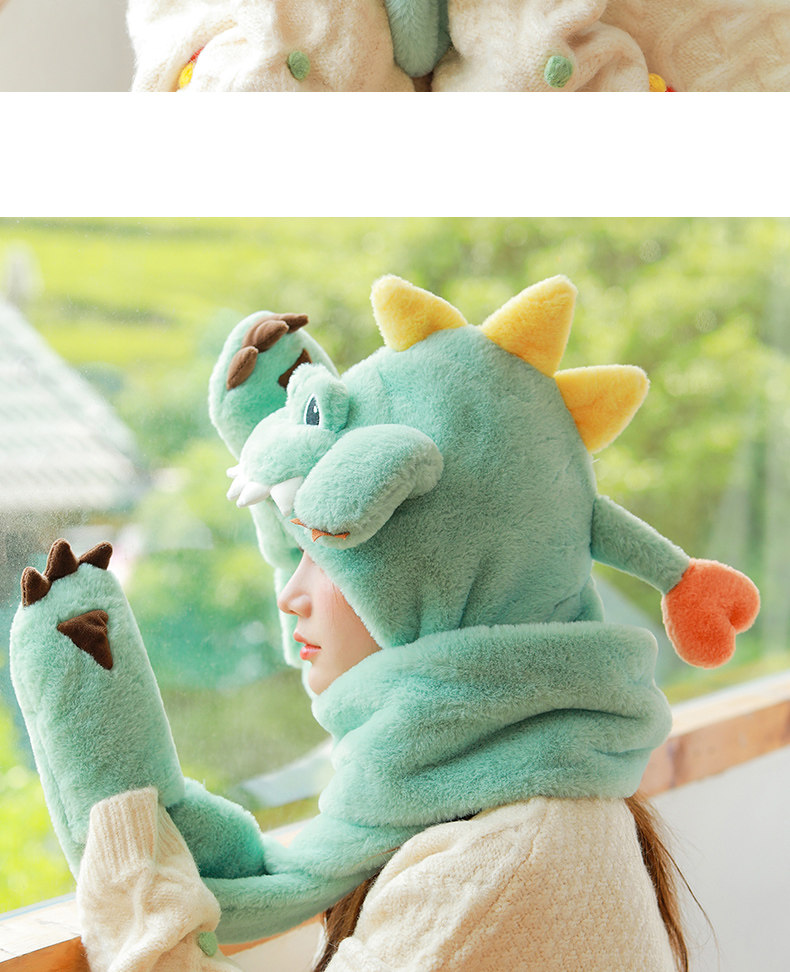 Динозавр, шапка, демисезонный шарф, удерживающие тепло милые плюшевые мультяшные перчатки, комплект, в корейском стиле, 3 предмета
