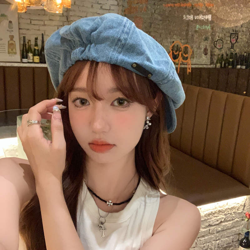 Художественный музей девушка Новый художник Юн Дуо Шляпа Борир Шляпа Большая Голова Большая джинсовая шляпа голубой восьмиугольники показывает маленькое лицо