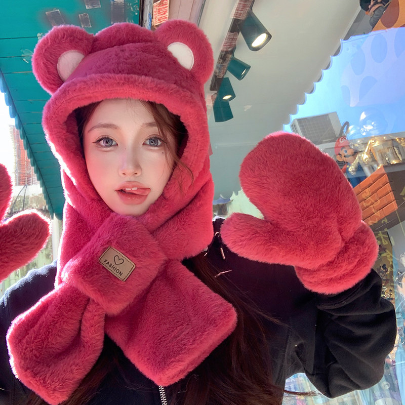 Шапка, шарф, медицинская маска, зимние милые бархатные красные перчатки, с медвежатами, плюшевая
