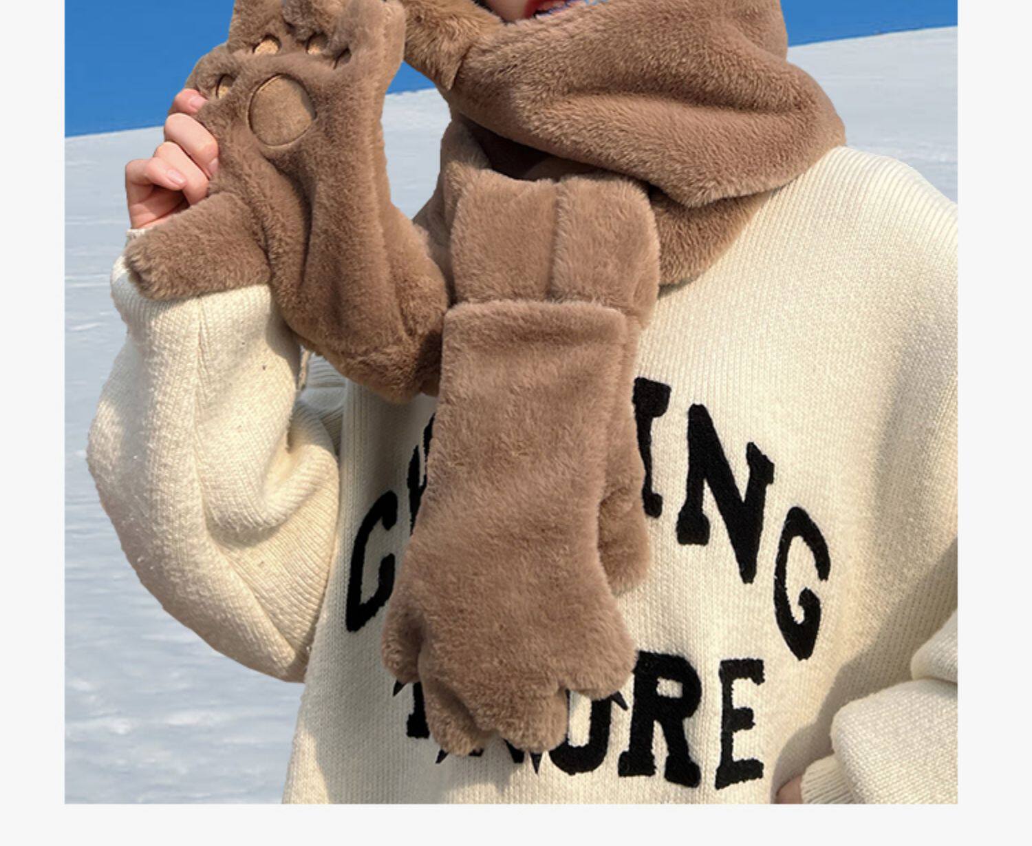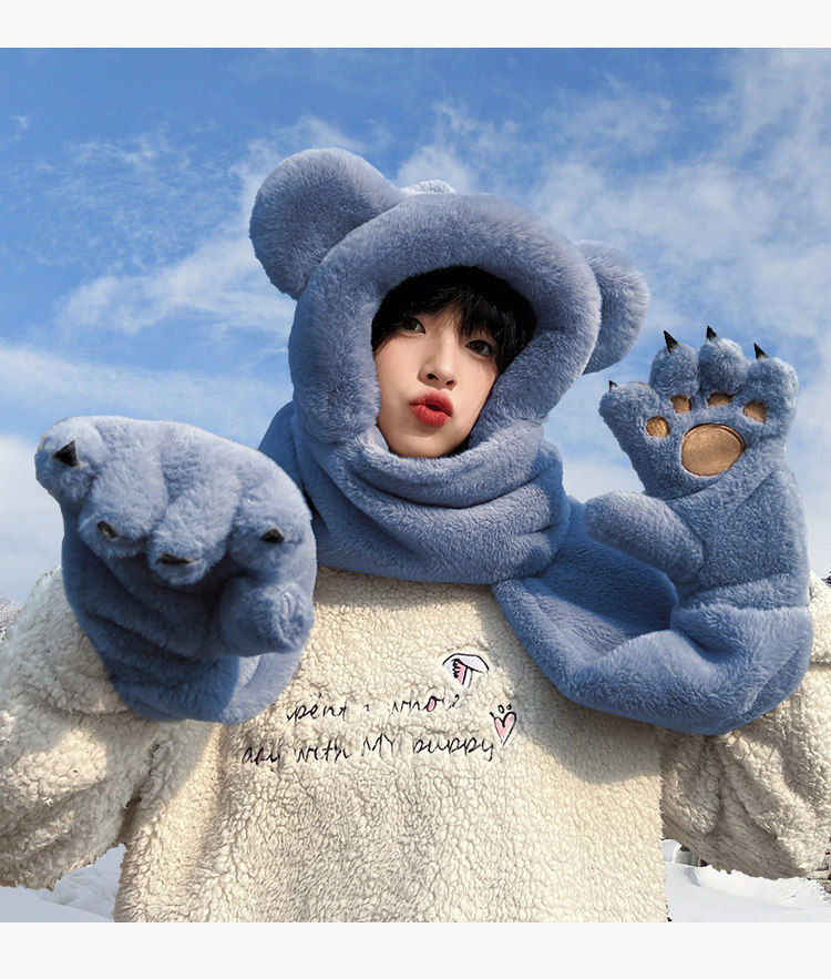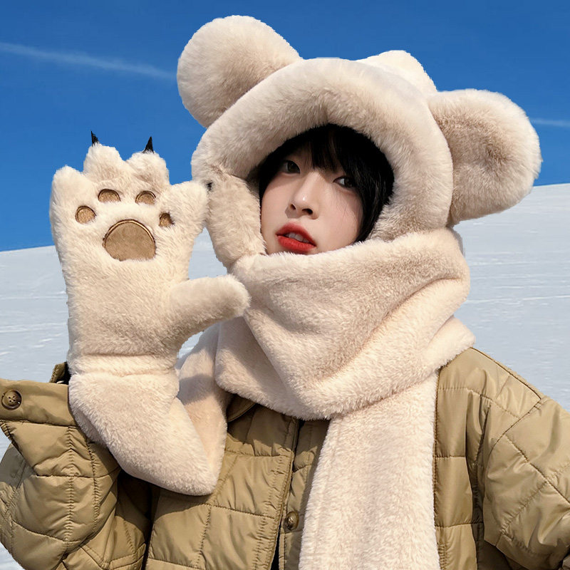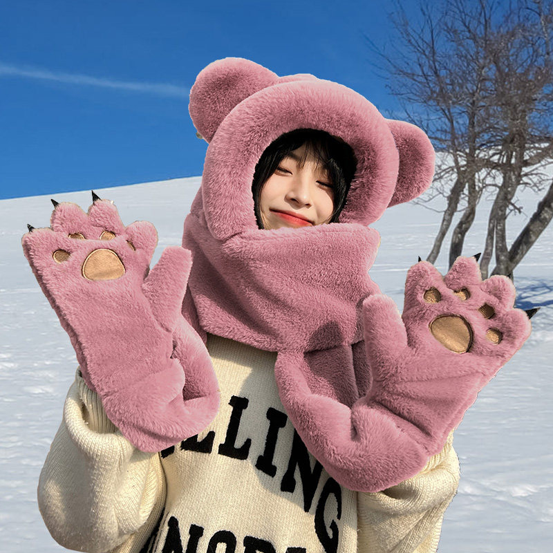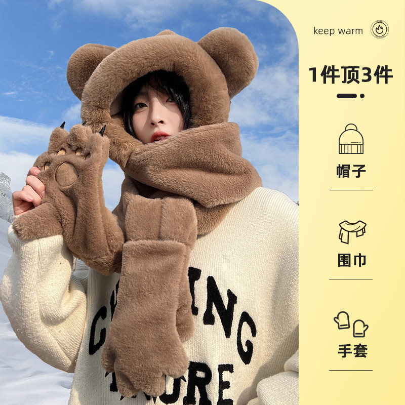 Зимняя милая шапка, удерживающий тепло мужской комплект, универсальные перчатки, шарф с капюшоном, с медвежатами, 3 предмета