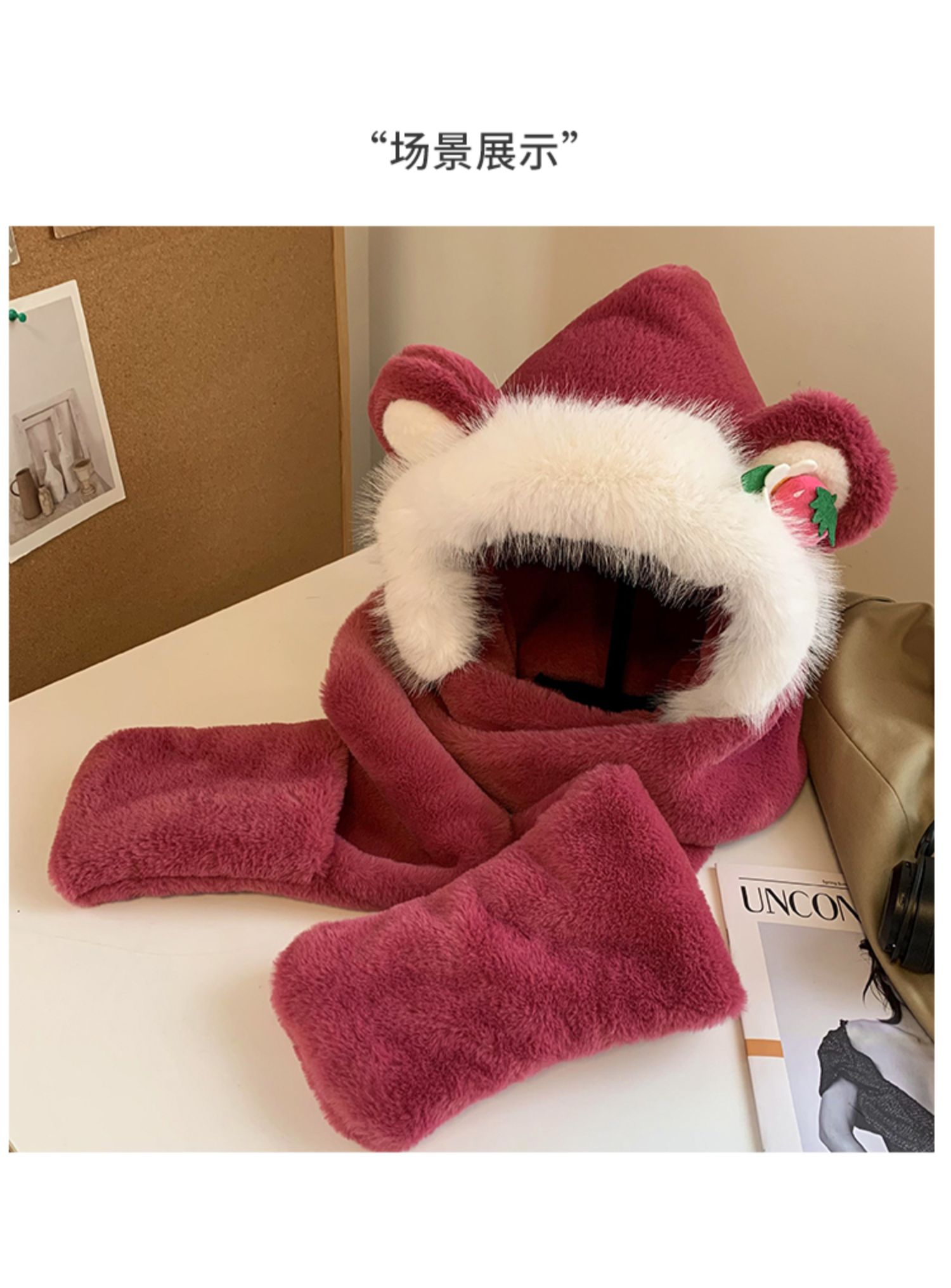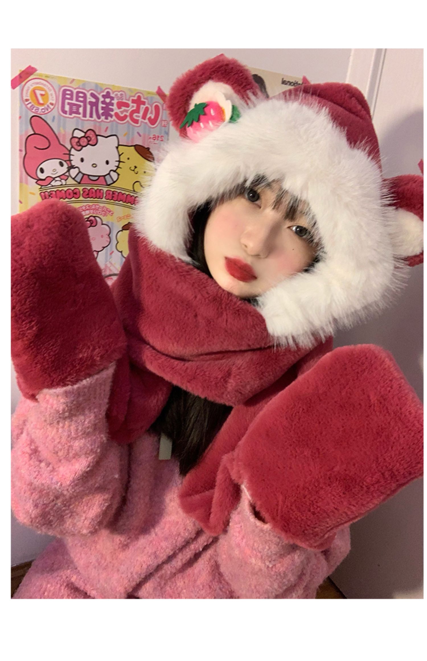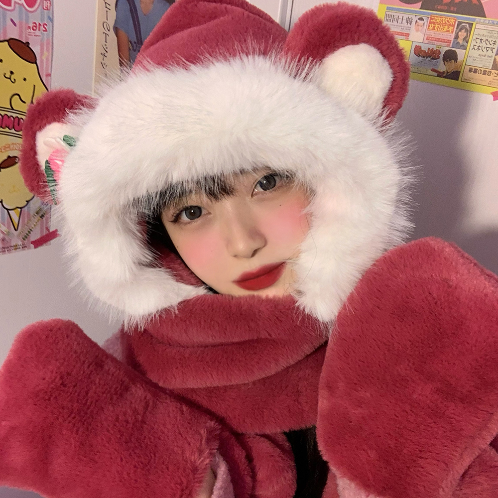 Клубника, шапка, зимний шарф, милые утепленные удерживающие тепло плюшевые перчатки, комплект, в корейском стиле, 3 предмета