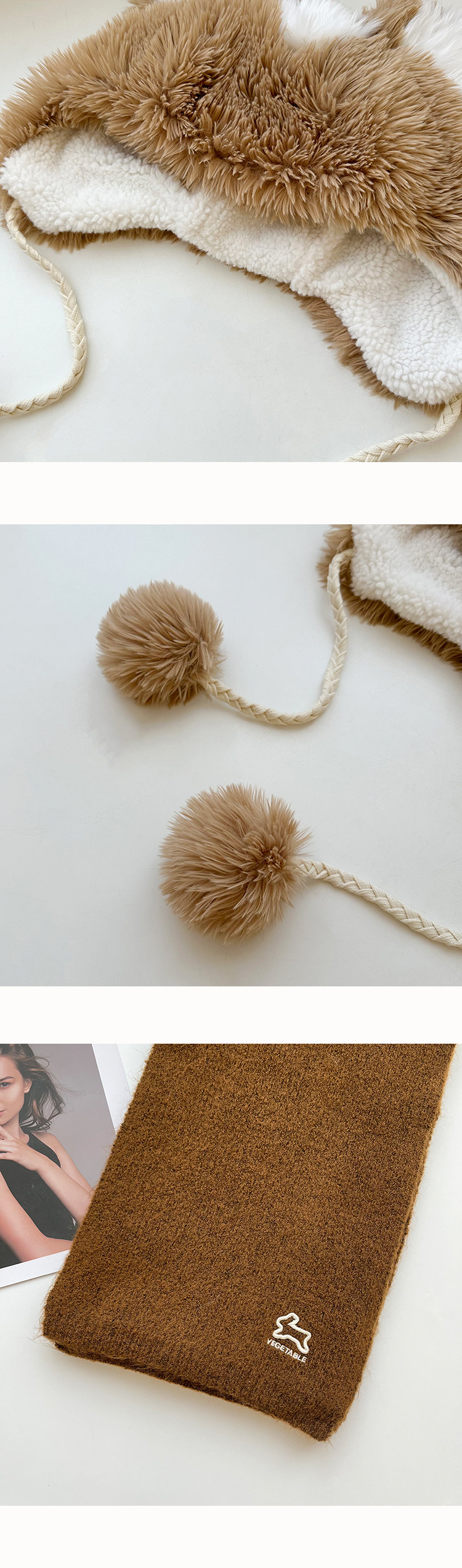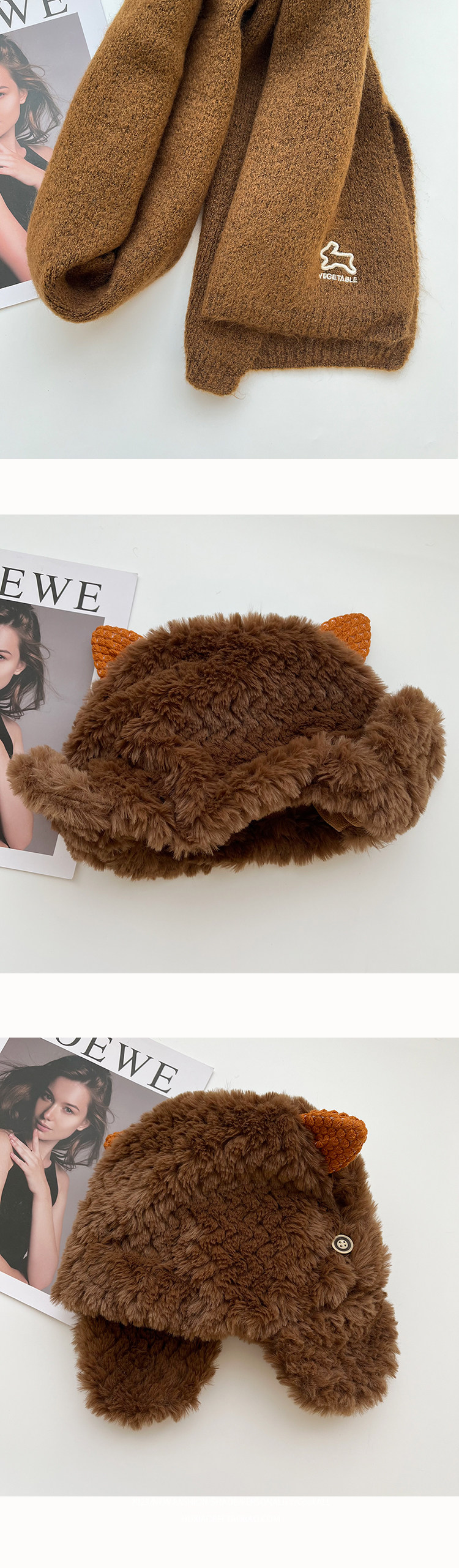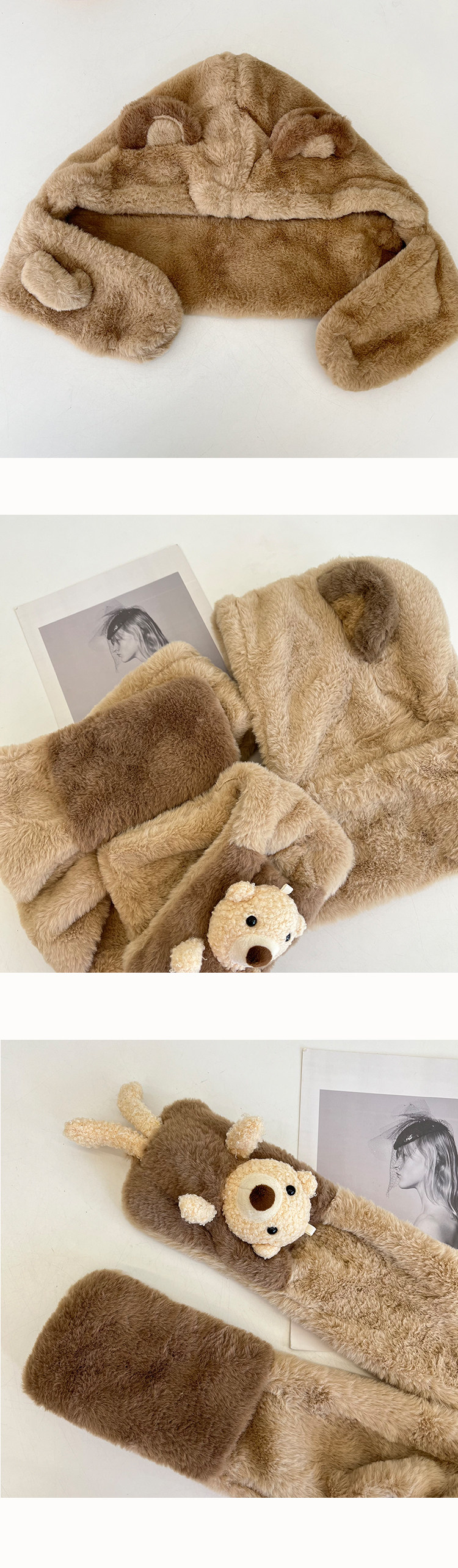 Ретро плюшевый демисезонный удерживающий тепло флисовый кофейный комплект, кролик, шарф, увеличенная толщина, 3 предмета, с вышивкой