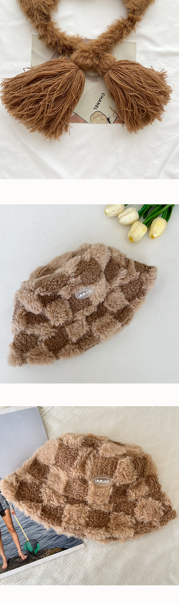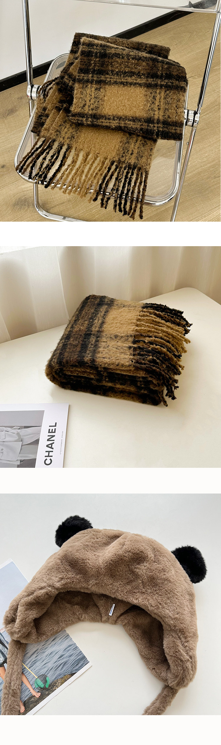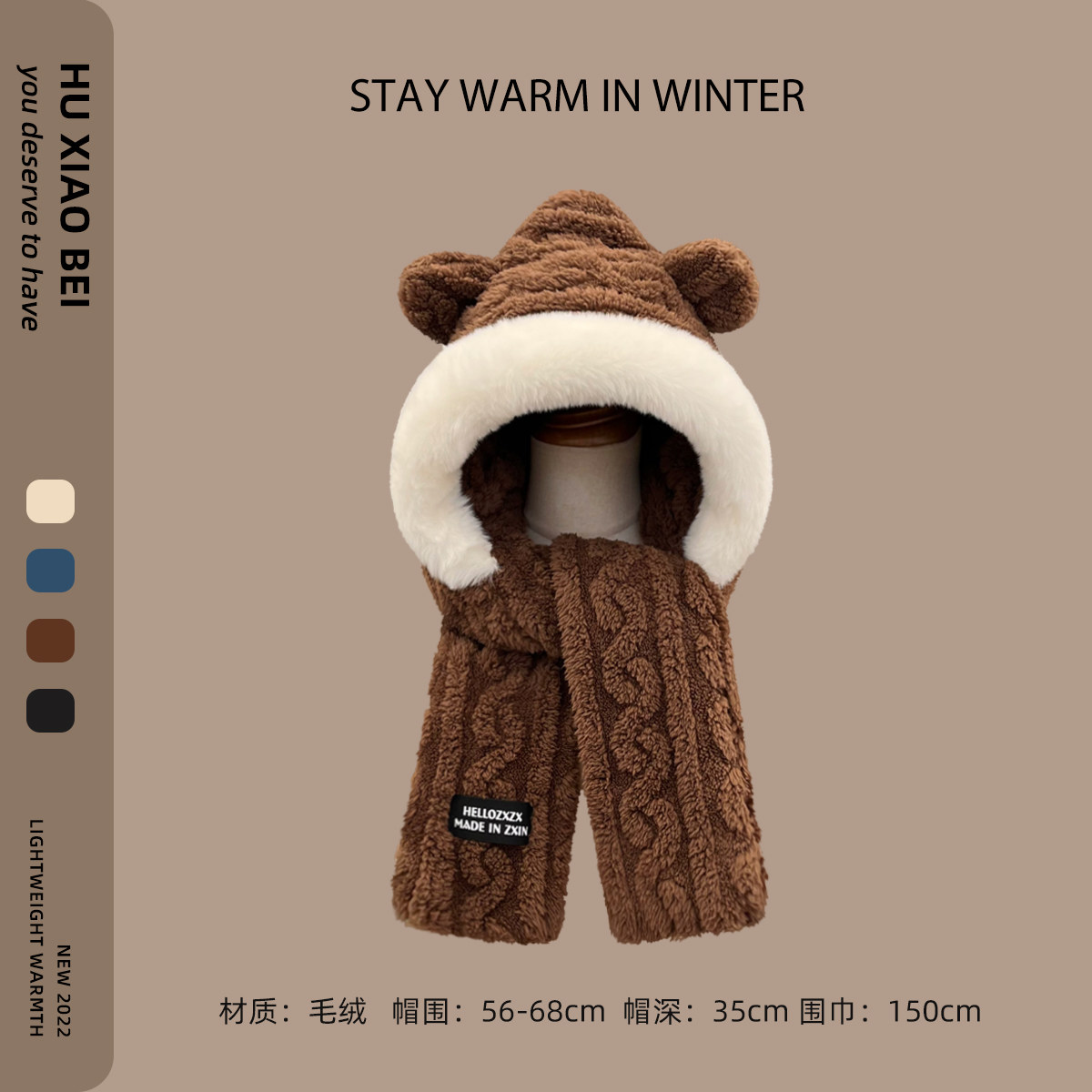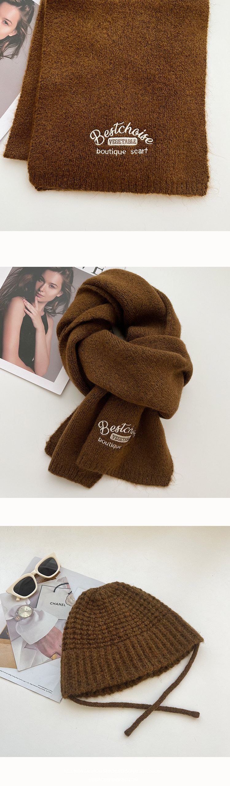 Ретро плюшевый демисезонный удерживающий тепло флисовый кофейный комплект, кролик, шарф, увеличенная толщина, 3 предмета, с вышивкой