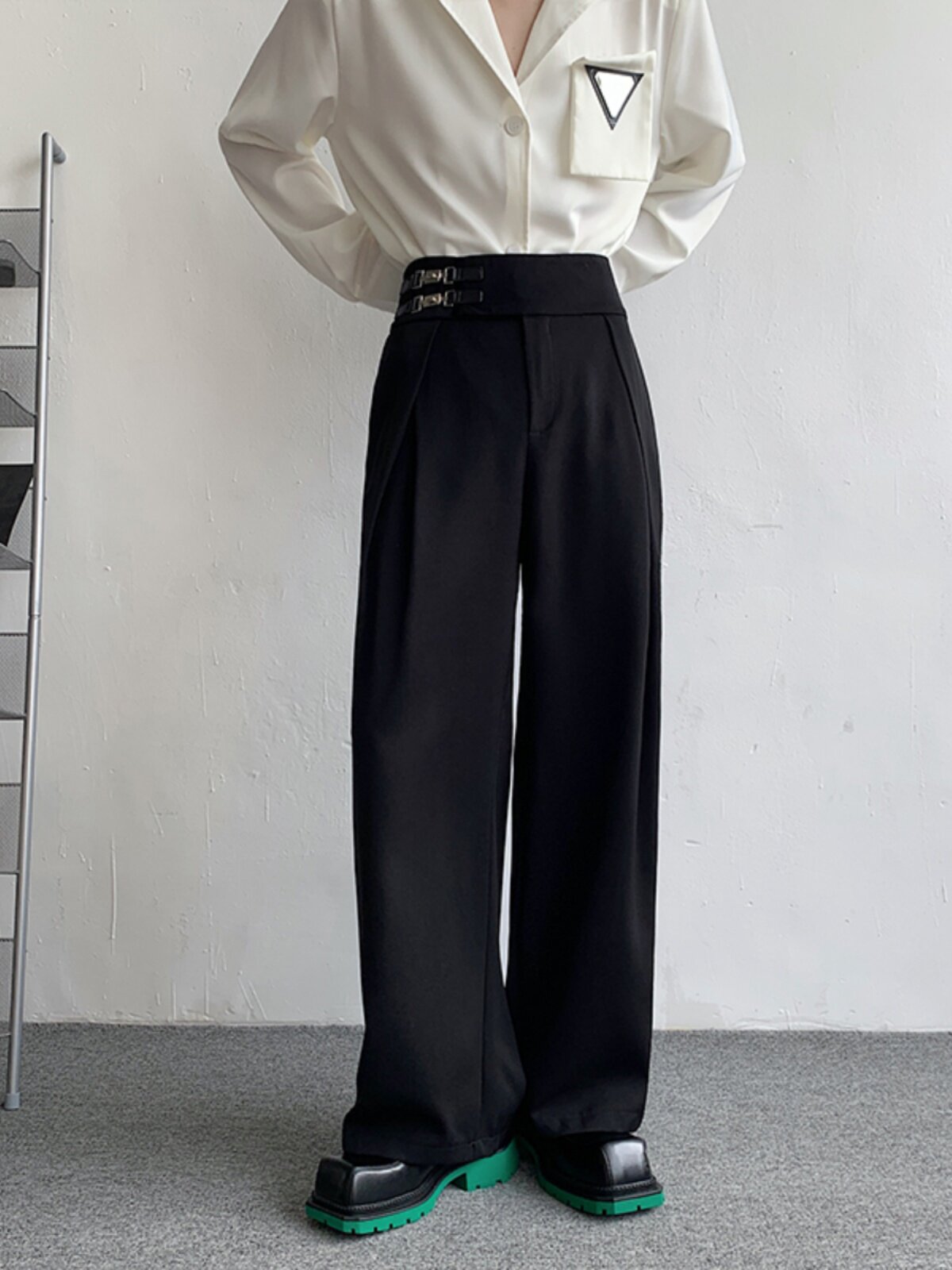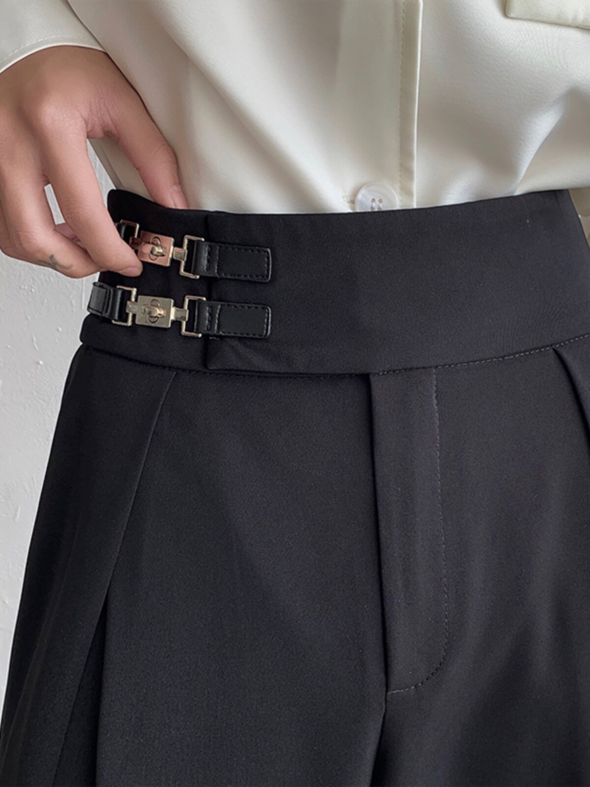 Летний костюм, штаны, металлический ремень, дизайнерская пряжка, изысканный стиль, тренд сезона, в корейском стиле, свободный прямой крой