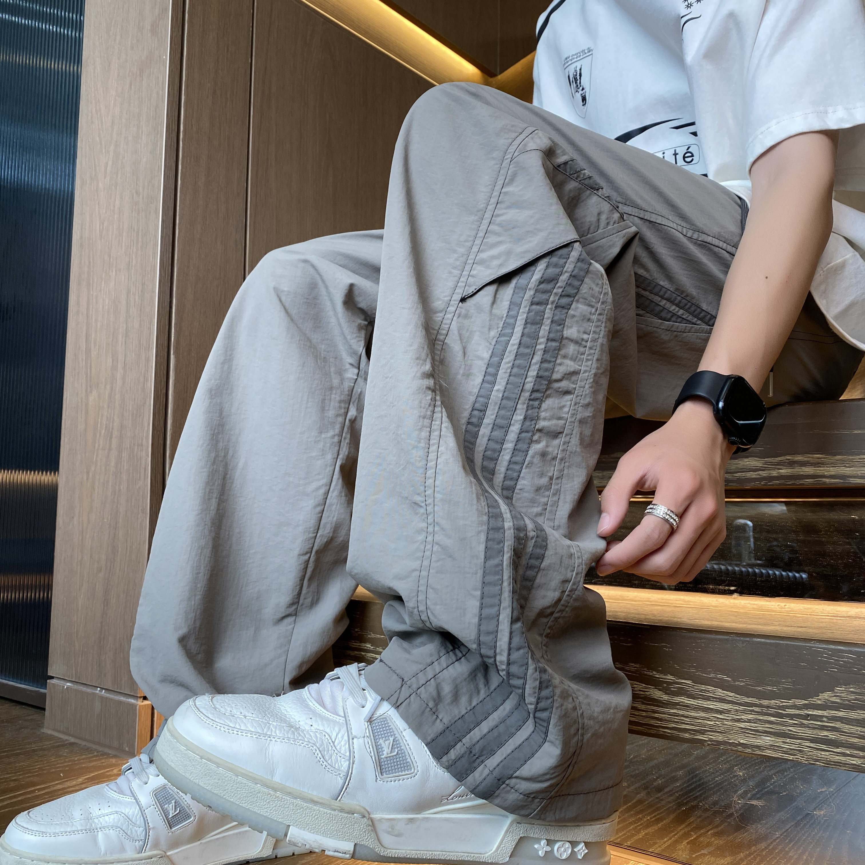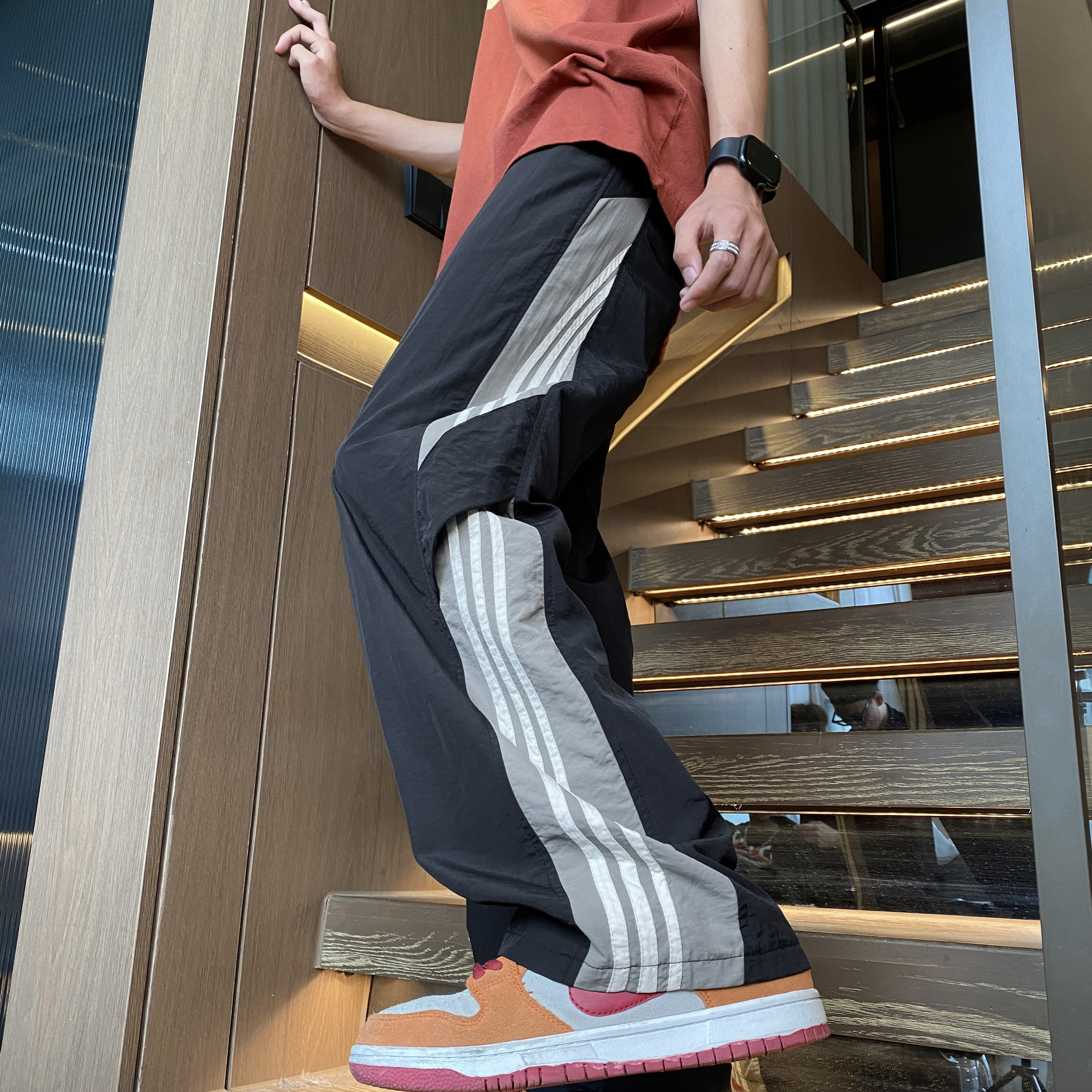 Черные быстросохнущие летние ретро спортивные шелковые штаны, в американском стиле, свободный прямой крой