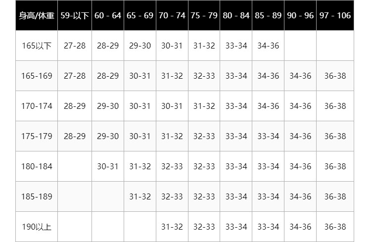 | Размер: | 29 170/76А(29)=2,42 фута≈80см, 30 170/78A(30)=2,49 фута≈83см, 31 175/80А(31)=2,56 фута≈85см, 33 180/84А(33)=2,71 фута≈90см, 34 180/86А(34)=2,79 фута≈93см, 36 185/88А(36)=2,94 фута≈98см, 38 190/92А(38)=3 фута≈100см |